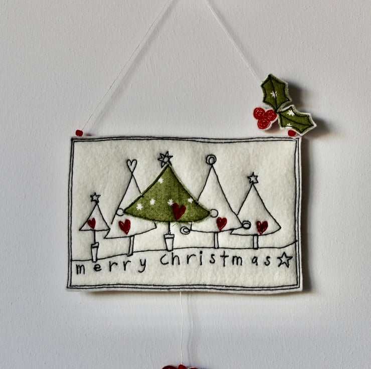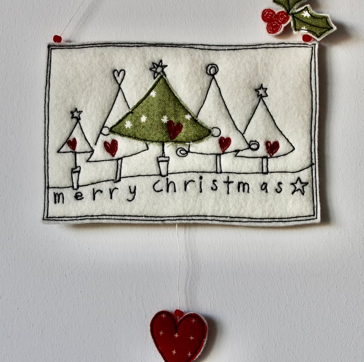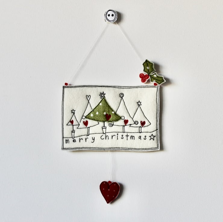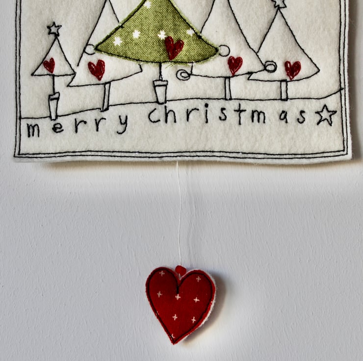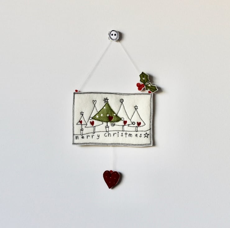 A delightful hanging decoration which is created using 100% wool felt, cotton cloth, red glass beads, free hand machine embroidery and is cut out by hand, using a very sharp pair of scissors.
