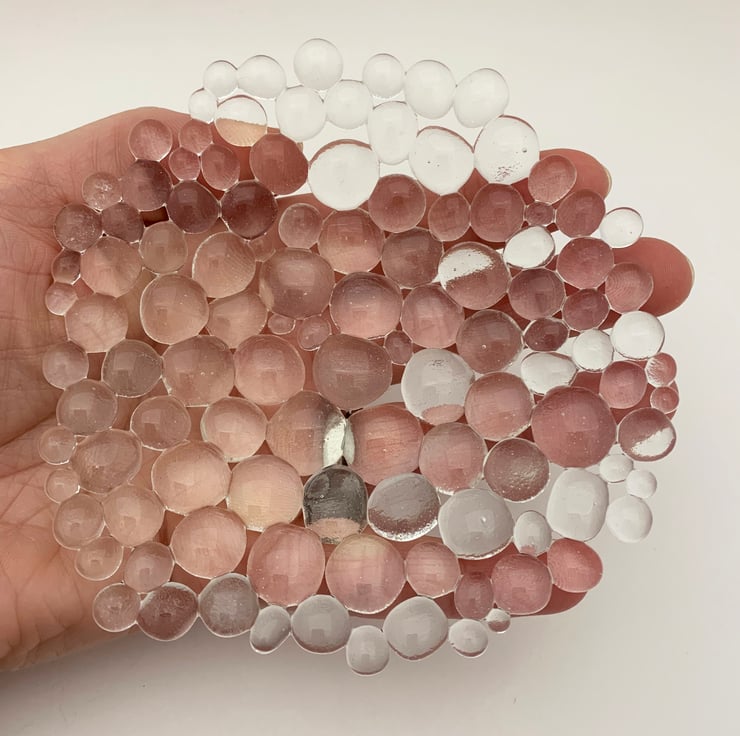 To make this dish, I hand cut tiny little squares of transparent art glass and fire them overnight in a kiln to make little nuggets of glass. I then arrange the pieces into a circular ceramic mould and fire the whole thing again overnight at a slightly lower temperature so they gently stick together and take on the shape of the mould. Transparent glass is handcut and assembled, therefore no 2 are exactly the same.