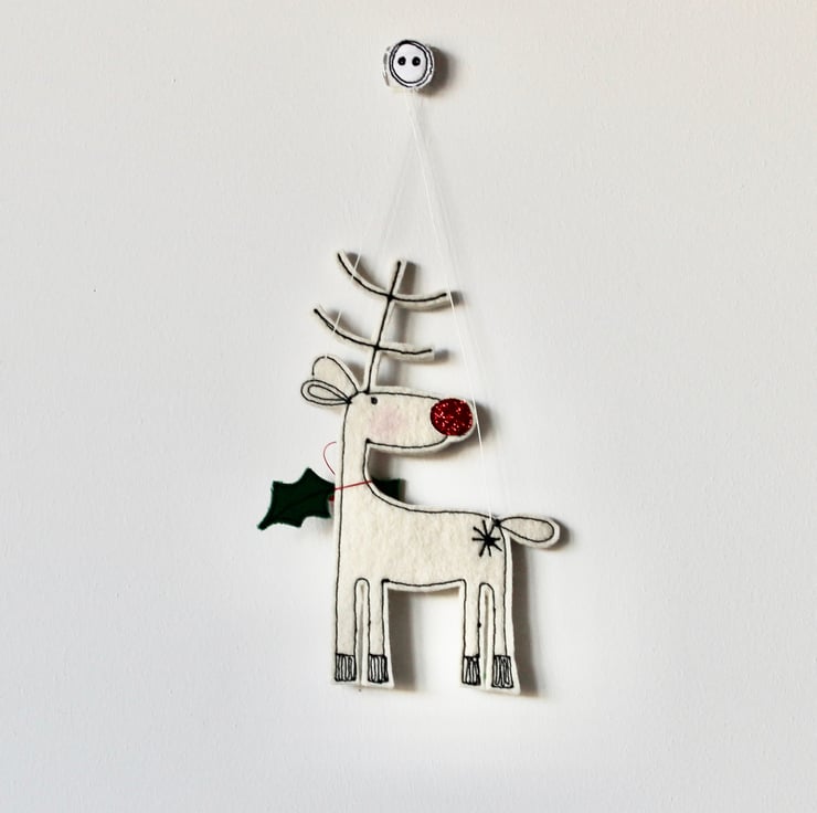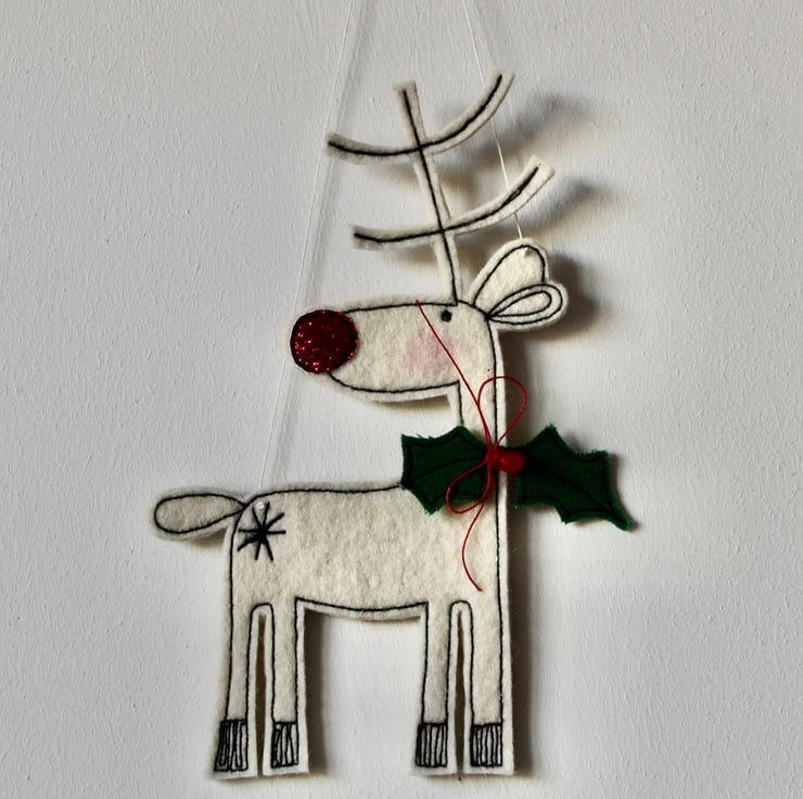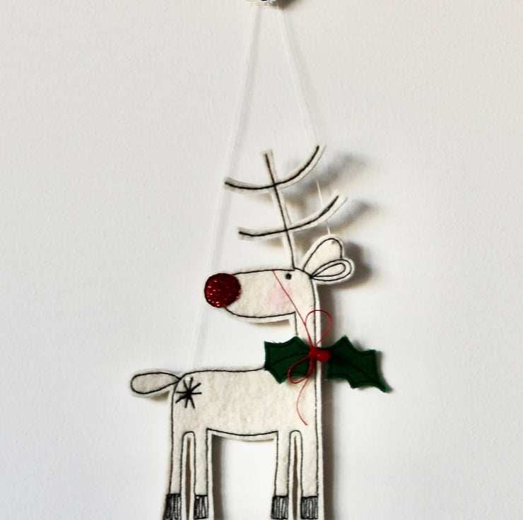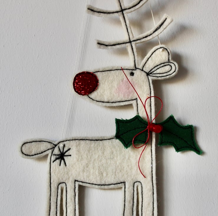 Reindeer is created using 100% wool felt, linen thread, cotton fabric, glitter cloth, red glass beads, free hand machine embroidery and is cut out by hand using very sharp scissors.