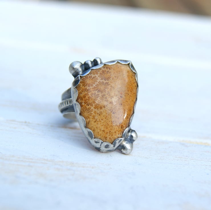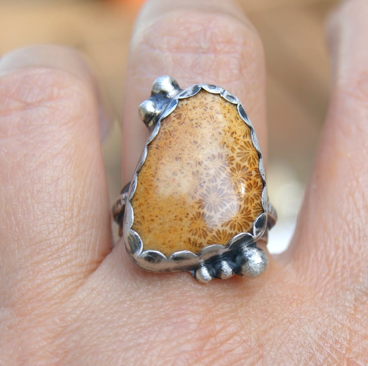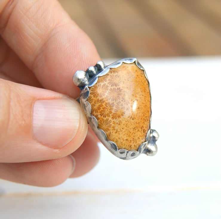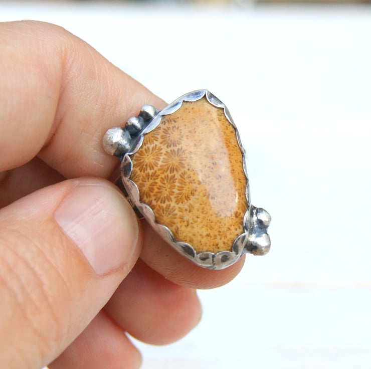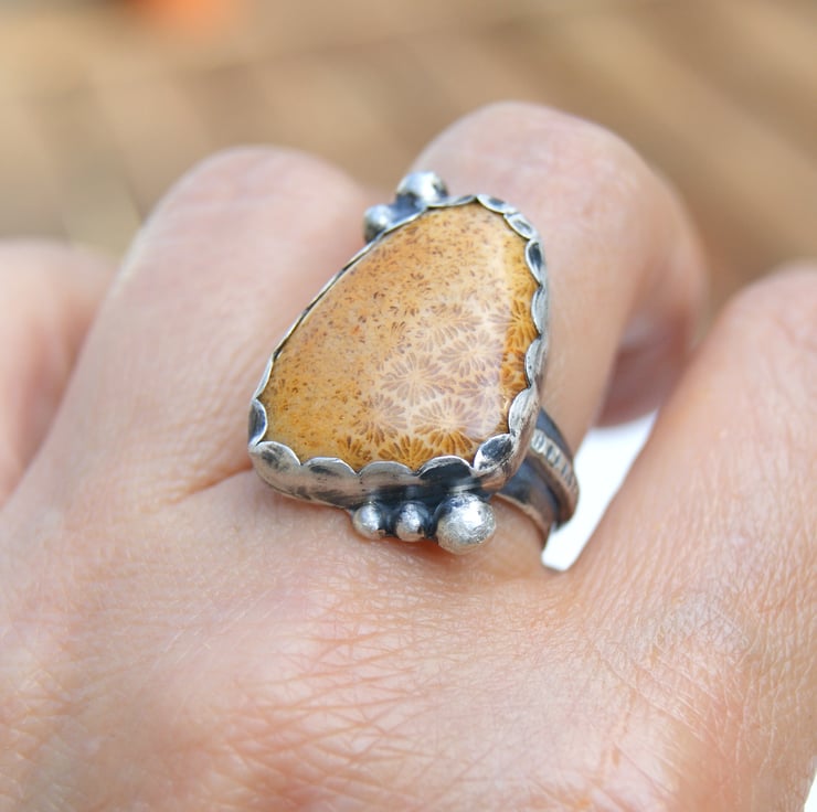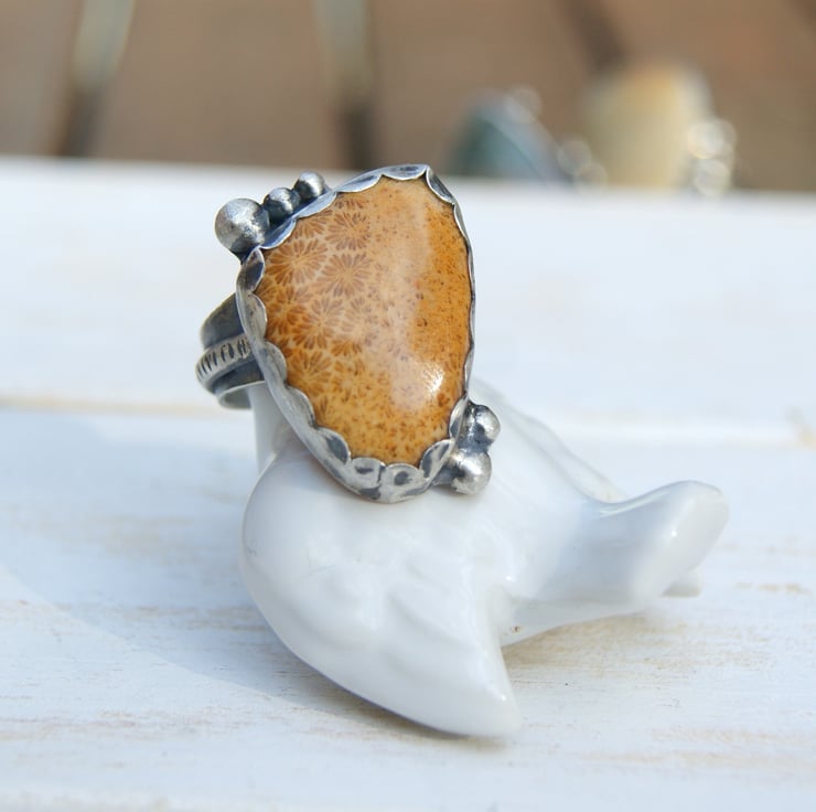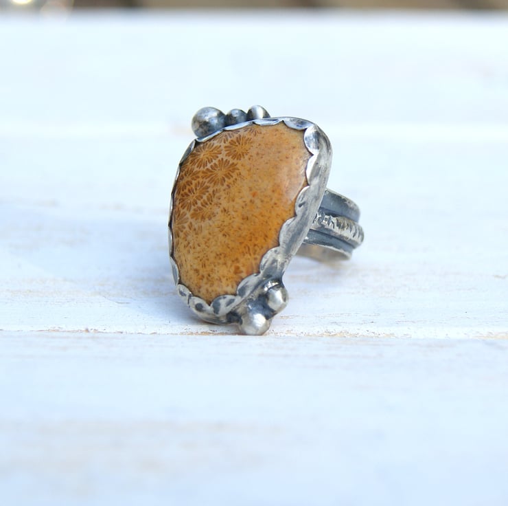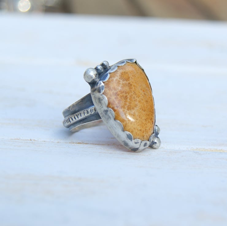 Stunning distressed sterling silver ring with a big Yellow Fossil Coral stone that is totally handmade. The wide, double-layered band has been hand forged from solid sterling silver and hand-hammered giving a gorgeous rustic boho look.