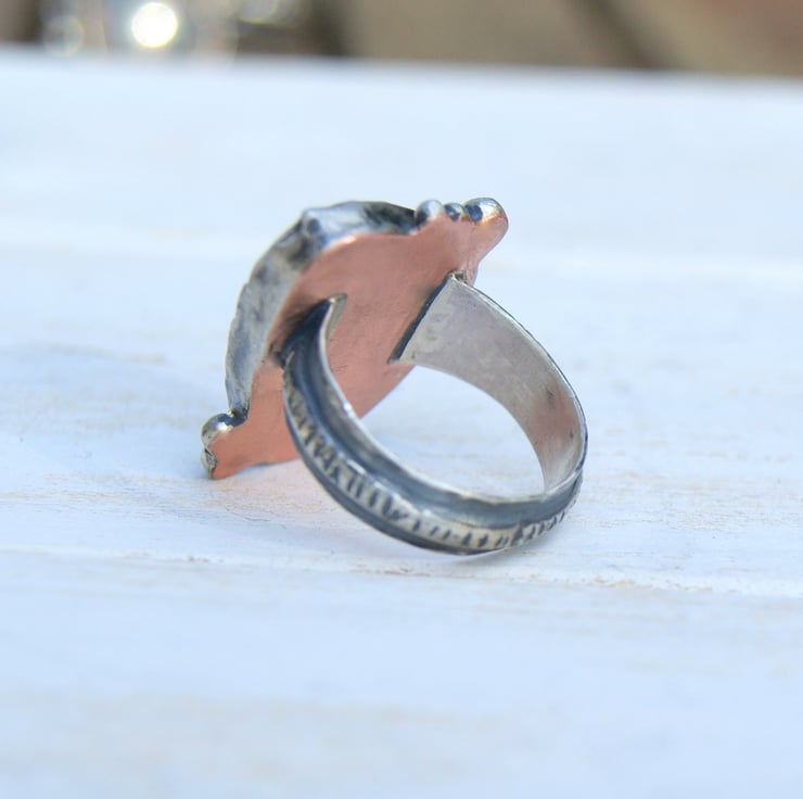 The stone is set in a handcrafted distressed look silver bezel on the pure copper bottom, with hand-formed silver balls. The ring has had a patina to bring out the wonderful textures and also gives it a vintage look.