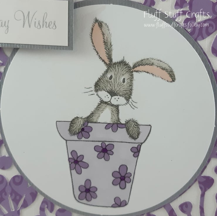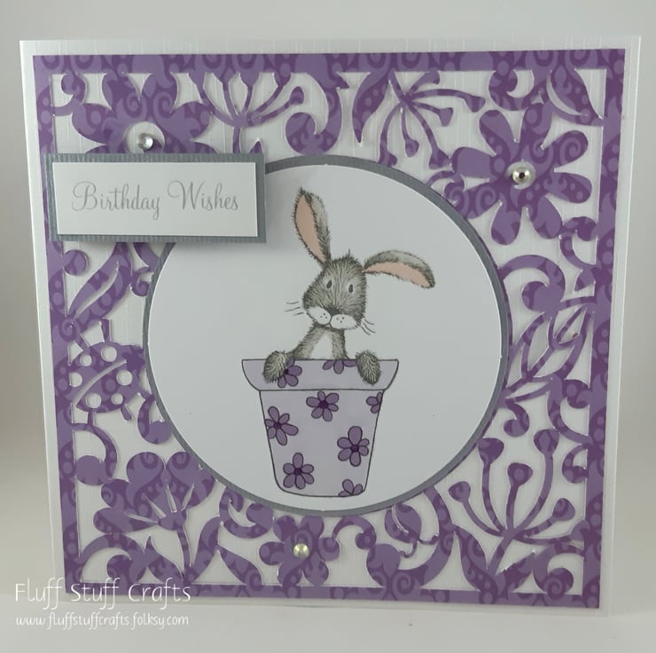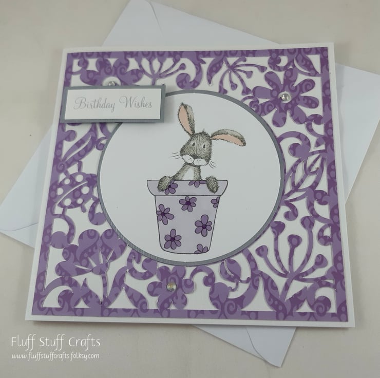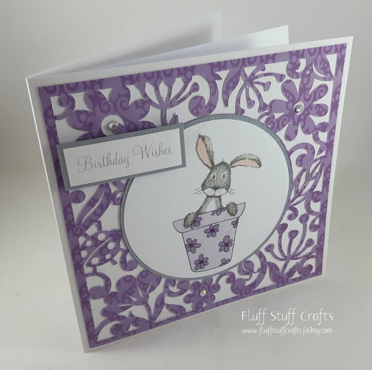 Square birthday card featuring a cute image of a rabbit in a plant pot. The image and sentiment 'Birthday Wishes' have been overlaid onto silver textured card, over a background of flowers die cut from patterned purple paper. The flower centres have been embellished with small gems.