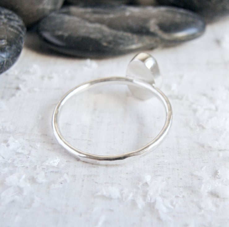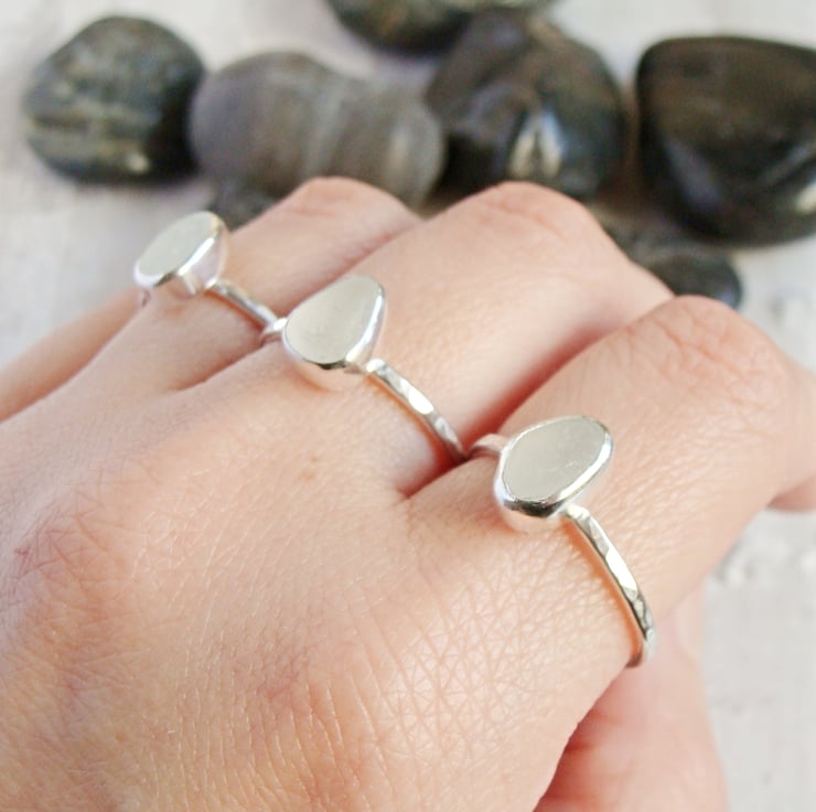 A perfectly rounded piece of genuine Seaham sea glass set into fine silver and made into this hammered sterling silver stack ring.