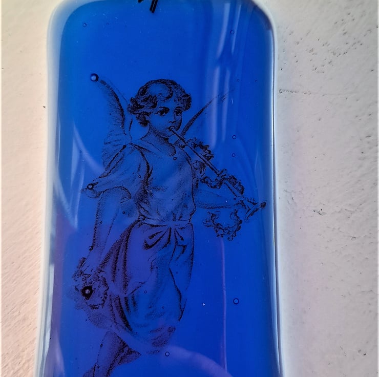 I make this by firing a vintage Christmas card image onto glass in my kiln. I love antique cards and often adapt them for my work.