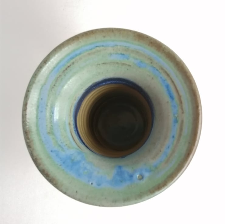 The vase is first thrown then left until it is leather hard, then turned and I add my makers mark. Once dry it is bisque fired then glazed and fired a second time at 1220 oC. All glazes are lead free.