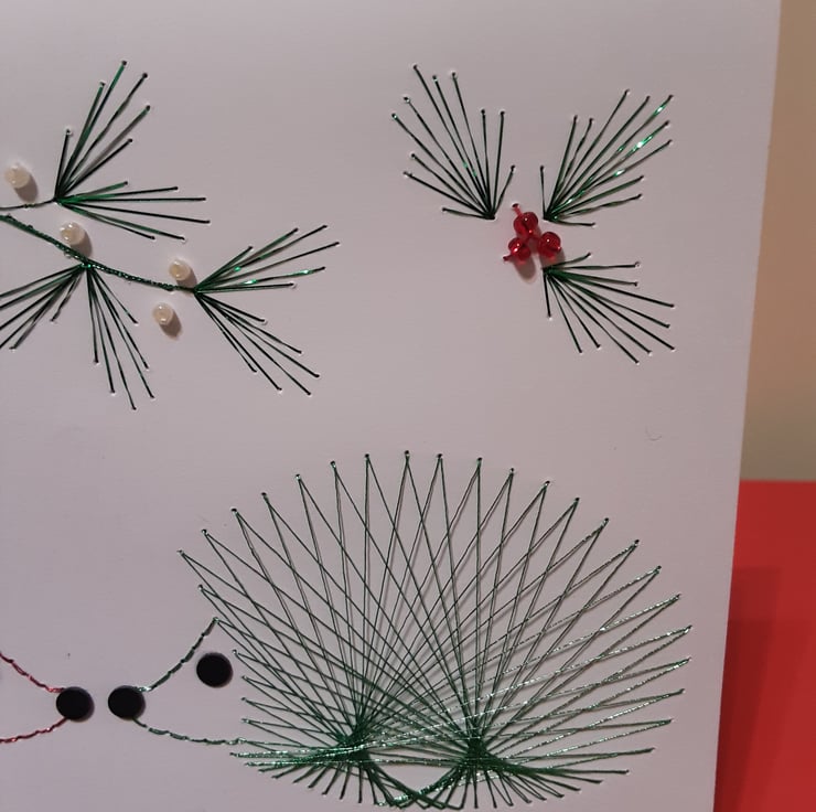 This cute Christmas card is hand embroidered with green and red metallic thread on a white card with a red insert left blank for your own message.