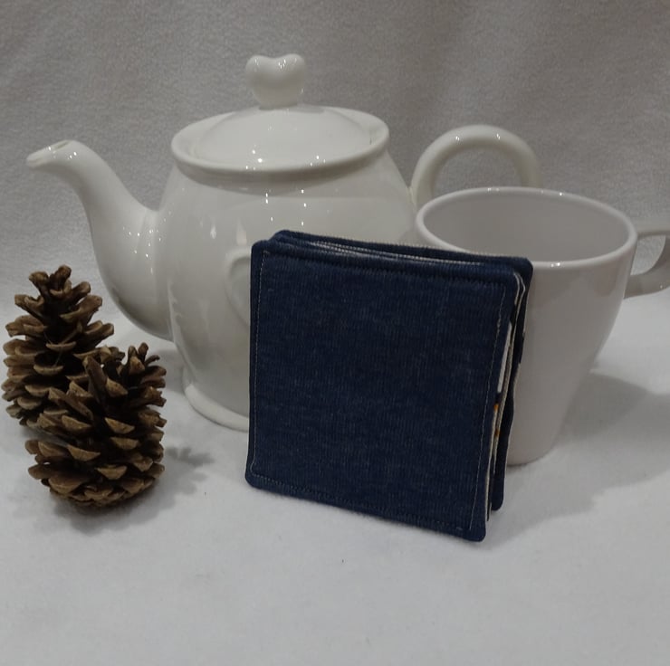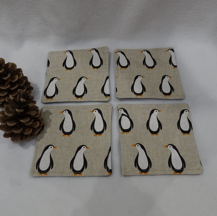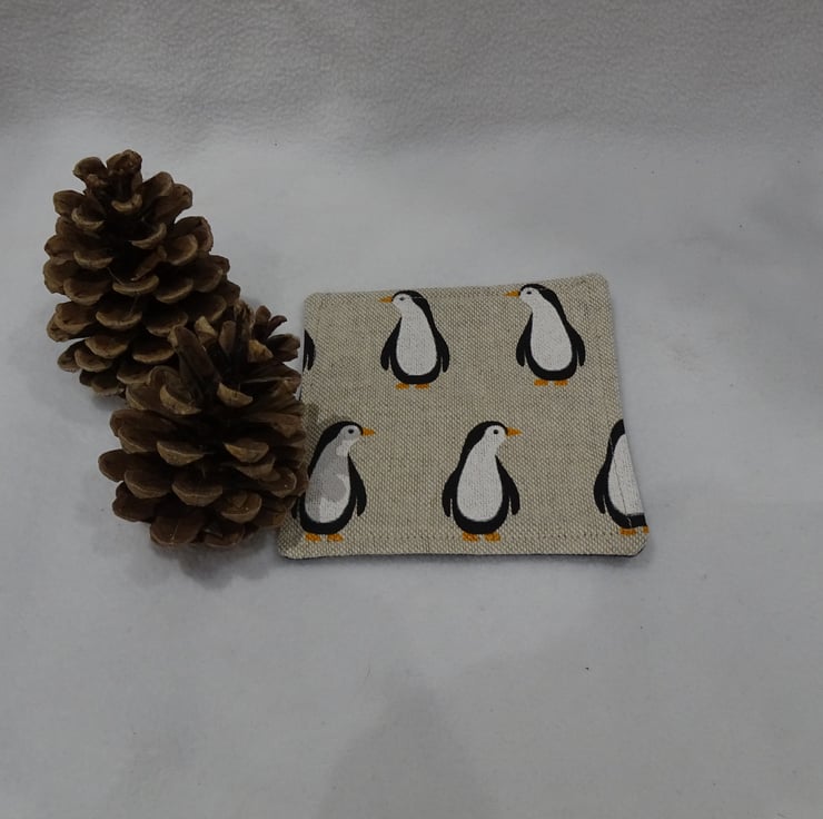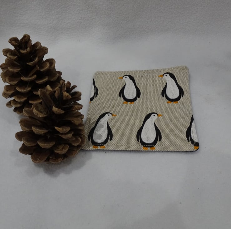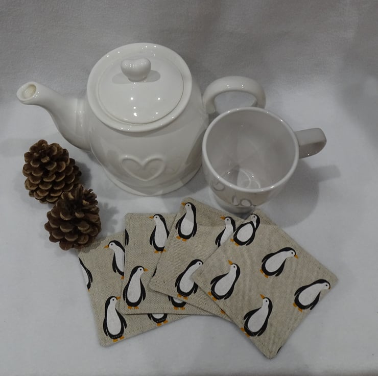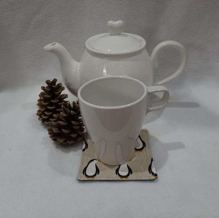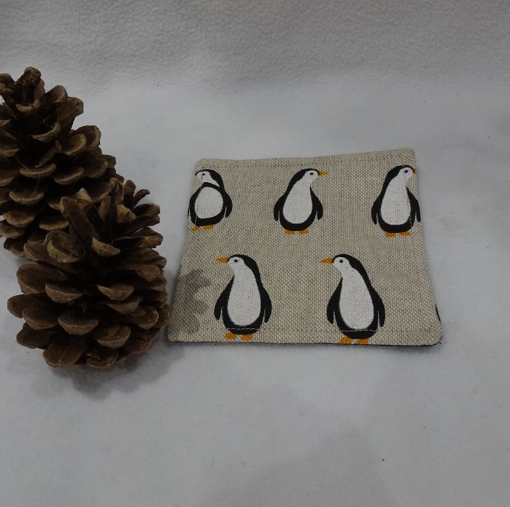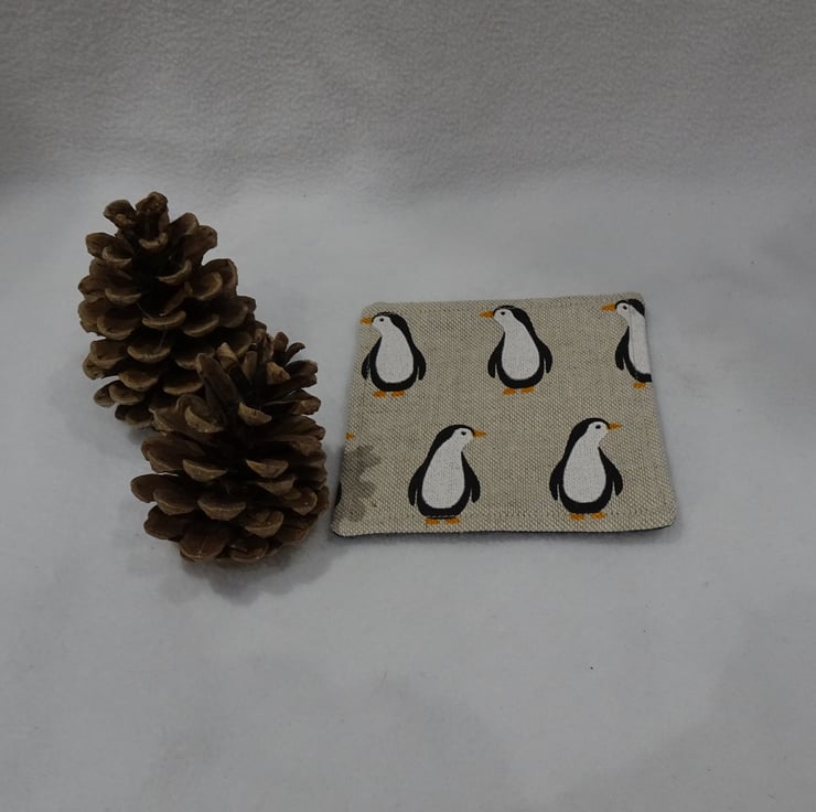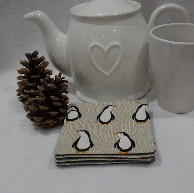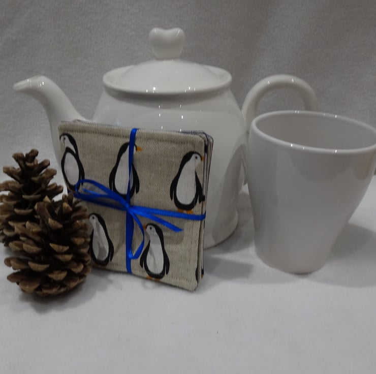 A set of 4, fabric, black and white penguin print coasters to liven up any tea time. No more cups sticking to the bottom of hard coasters! These coasters measure approximately 95mm by 95mm (9.5cm by 9.5cm) and consist of three layers; the main fabric, a thin layer of wadding inside and a lining of a denim look, thin cotton. This makes them soft and tactile to the touch. Can also be used to stand pot plants on or other items where you want to protect surfaces. The 4 coasters are bound together with gift ribbon measuring 750mm (75cm) in royal blue.