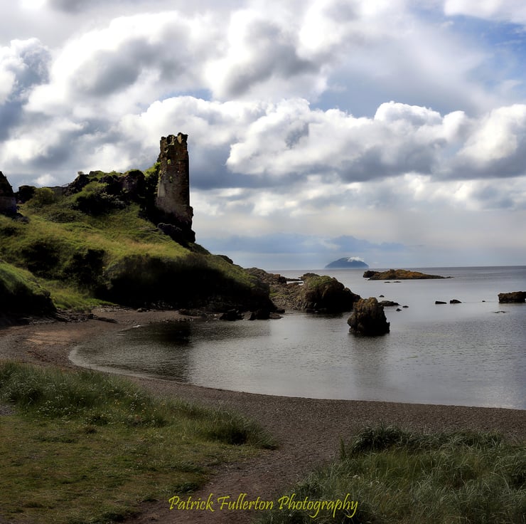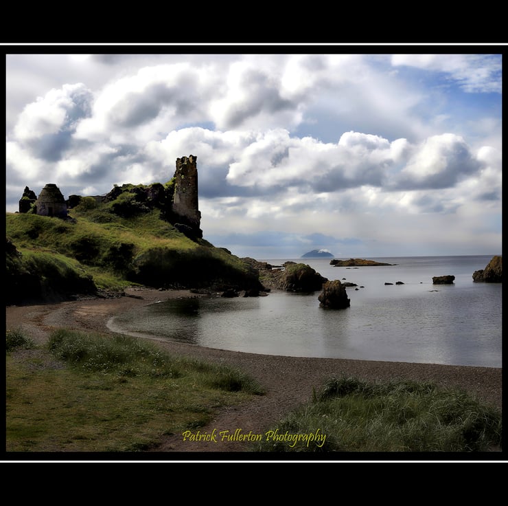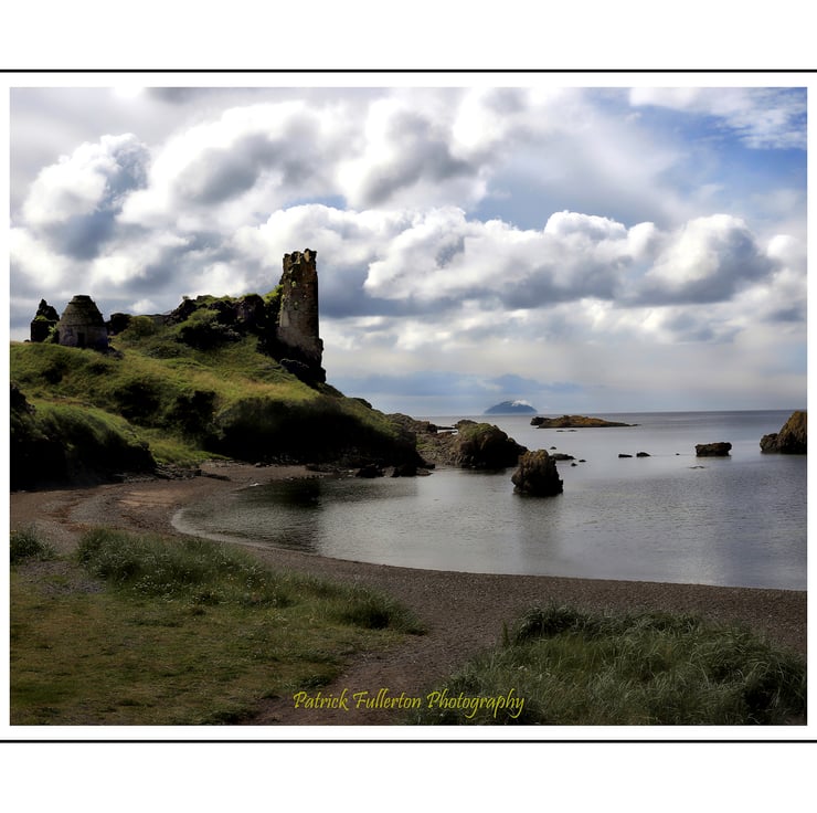 Photography, Fine art archival print. Dunure castle, Ayrshire coast south west Scotland.. the castle stands in ruins on a rocky promontory on the Carrick coast, overlooking the small harbour of Dunure.The site dates from the late 13th century; the earliest charter for the lands dating from 1256, but the remains of the building are of 15th- and 16th-century origin. One tradition is that the castle was built by the Danes and another states that the Mackinnons held the castle from Alexander III, as a reward for their valour at the Battle of Largs.