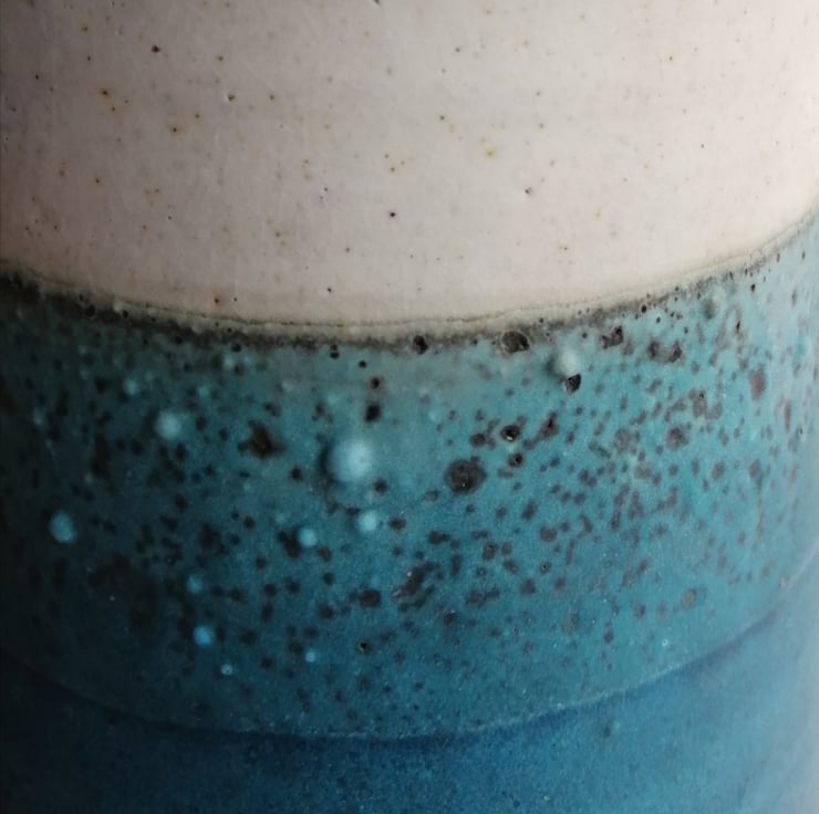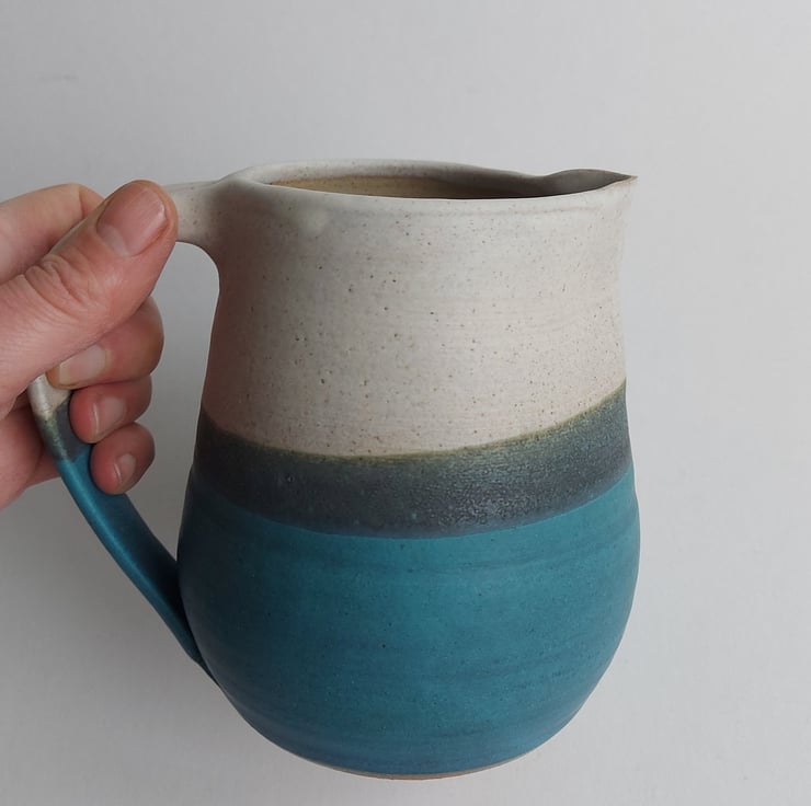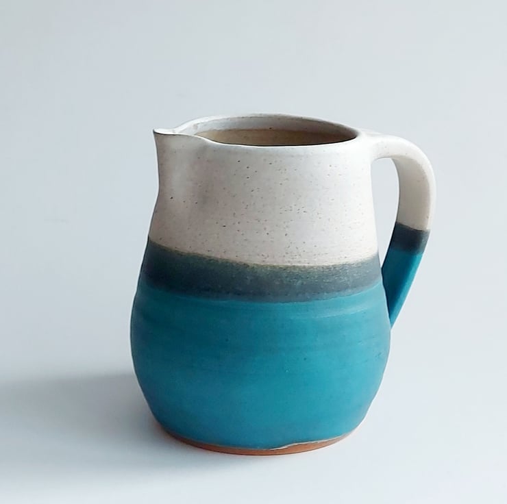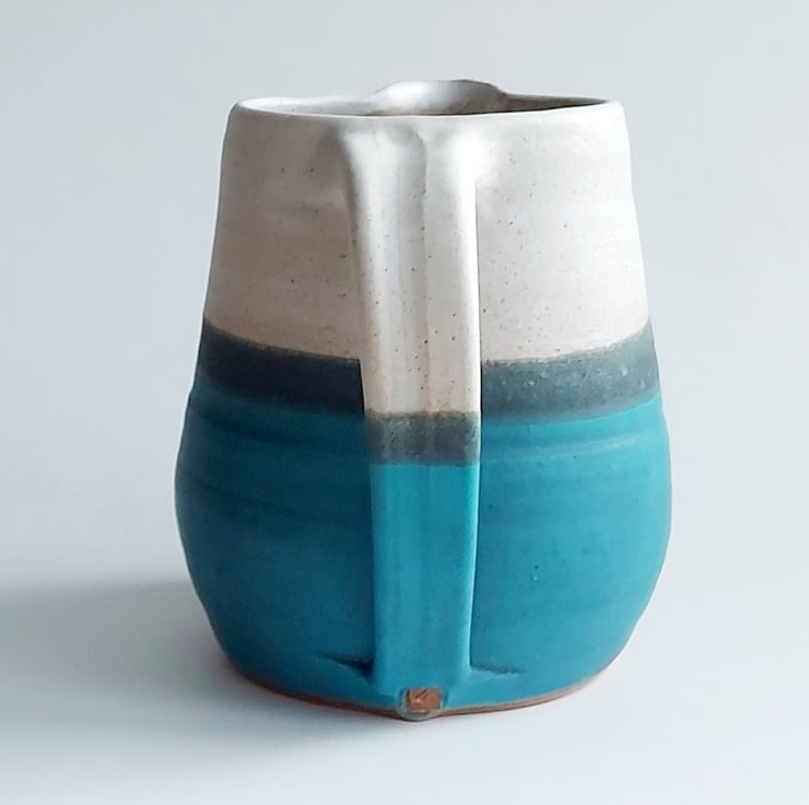 This ceramic jug is made from stoneware which means it is very durable. The clay gives a biscuit speckled colour which contrasts with the glaze. I've applied 3 lead-free glazes. Clear gloss inside and then a mat creamy glaze and a turquoise blue. Where these glazes meet they interact to make an area of varied colours. There is added texture in this layer.