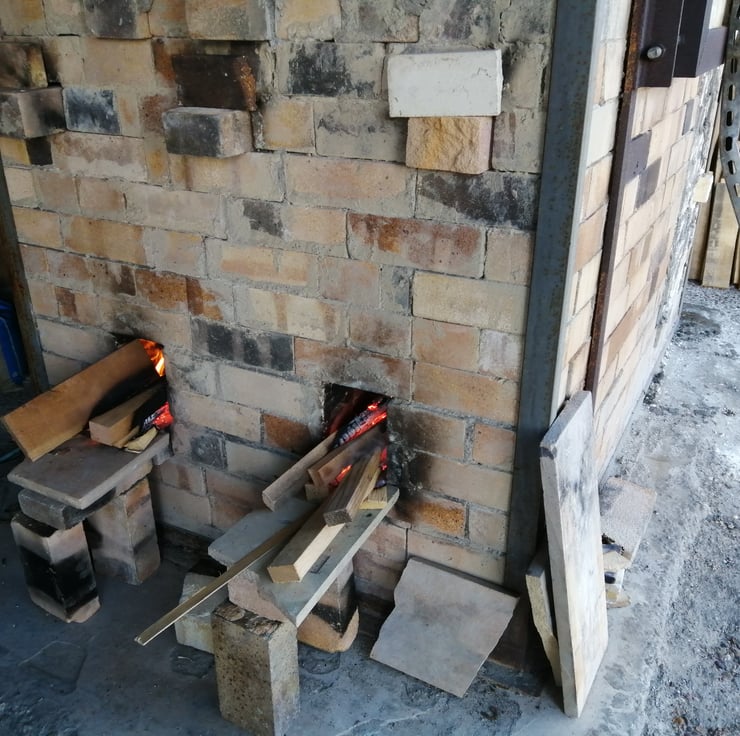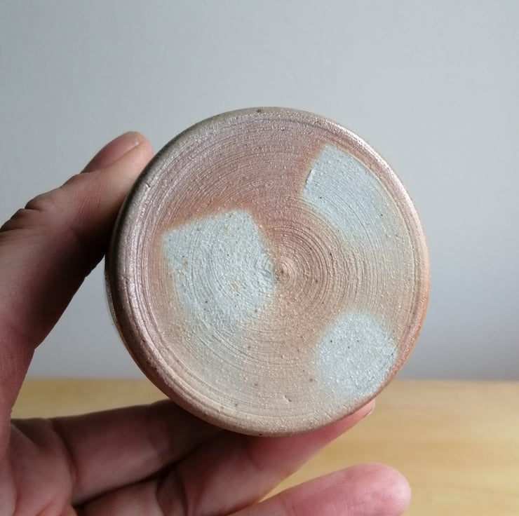 It has been fired in a wood fuelled kiln. This makes the markings and glaze very unique as the position in the kiln determines the conditions during the firing are much less predictable than an electric kiln. The clay gives a biscuit speckled colour which has a rose shine to it where the flame has kissed it. The glaze is a celadon green and lead free, with slight crazing when you look closely. The marks on the base are from wadding which is attached to stop it sticking to the shelf during firing.