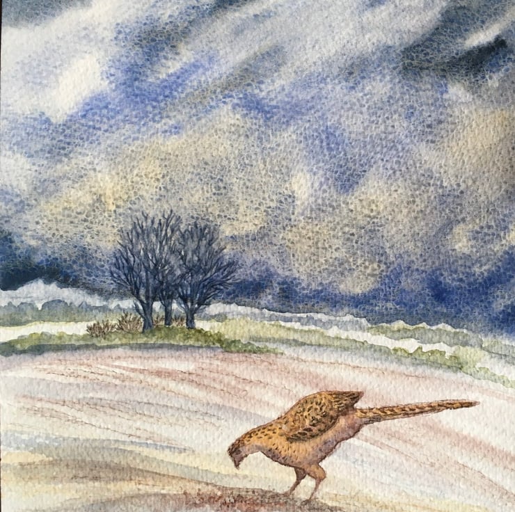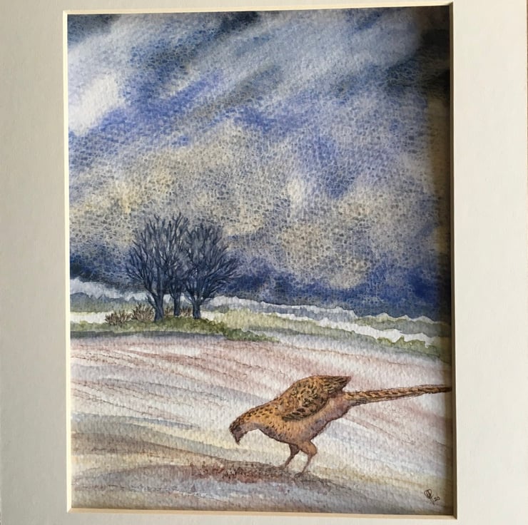 This is a hand painted original on watercolour paper, of a pheasant in the winter countryside and a sky ready to snow. It measures approx 10” x 8” and will be supplied with mount in a cello bag for protection. Postage is free to UK destinations. This artwork can be placed in a frame of this size available from various high street stores.