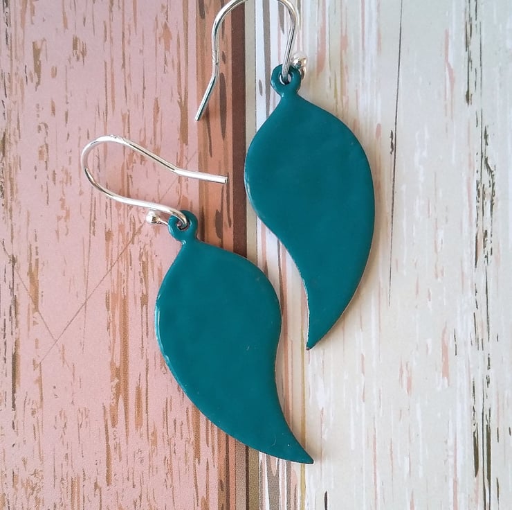 An elegant pair of leaf shaped copper earrings in blue, white and teal enamel. The earrings have been kiln-fired and each measures 34mm long and 14mm across the widest point. They come complete with sterling silver earring wires, and the backs have been finished in glossy turquoise enamel. They are supplied with a little organza pouch and POSTAGE IS FREE!