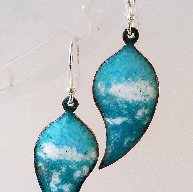 I have built up several layers of enamel to form a lovely sea and cloudscape with frothy waves and fluffy clouds. A great reminder of summer days! An elegant and timeless pair of leaf (or feather) shaped earrings, I will definitely be using this shape again as it would suit any hairstyle or shape of face.