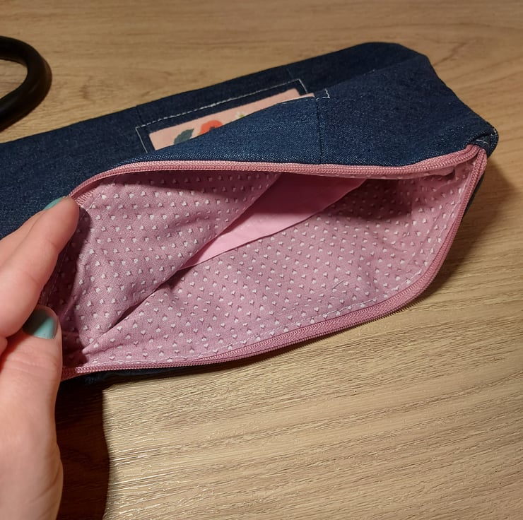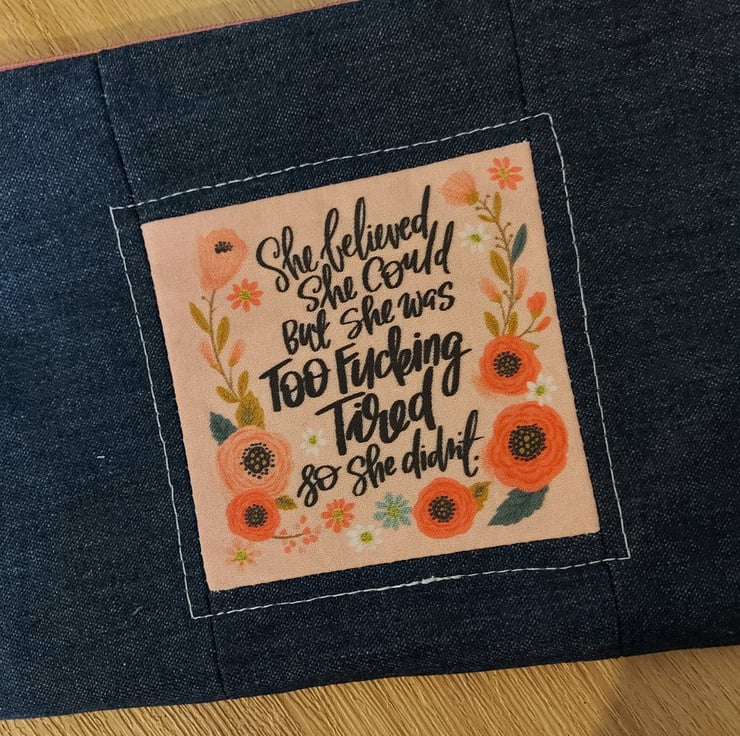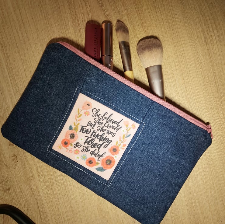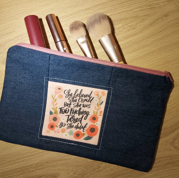 This is a hand made one of a kind make up bag or pencil case users choice , in a beautiful dark blue denim . The lining is a dusky purple with pint rose bud print and plain pink divider . The real feature of this range is the panel on the centre front of the bag this one reads '' she belived she could but she was to fucking tired so she didnt '' surrounded by poppy's and wild flowers . This hole collection is a little bit cheeky but all beautifully don there are no repeats in this collection so every bag is a one off they are all also roughly 10 by 6 inches with a 9 inch zip .