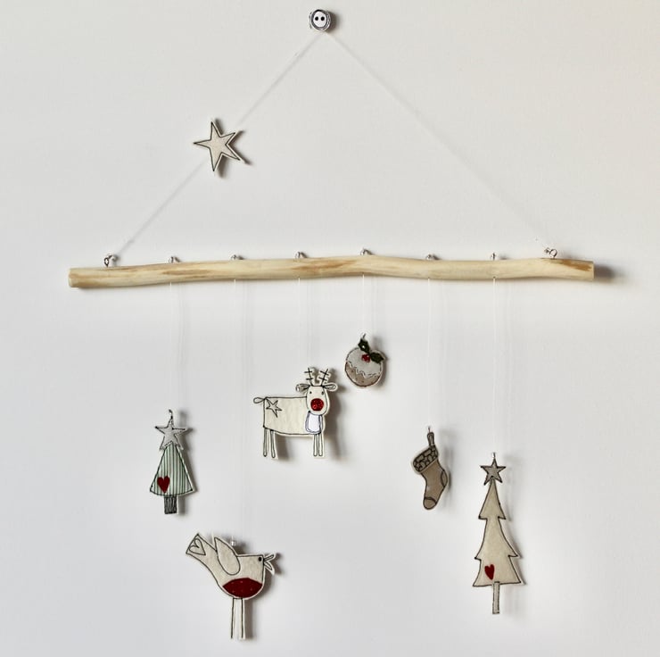 100% wool felt, cotton cloth, glitter fabric and free hand machine embroidery; multiple layers of cloth are sewn together and cut out by hand using very sharp scissors. There is a linen thread to hang.
