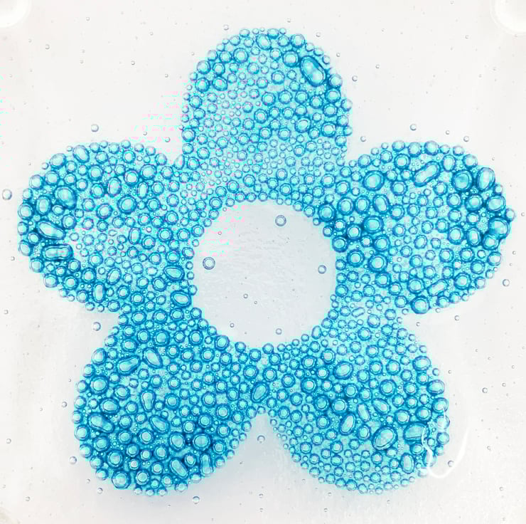To make the coasters I cut art glass into 10cm squares and use specialist paint to carefully paint my flower design. I then cap it with another square piece of glass and fire it overnight in my kiln. The heat of the kiln turns the paint into tiny turquoise bubbles. Transparent glass with turquoise bubbles captured inside.