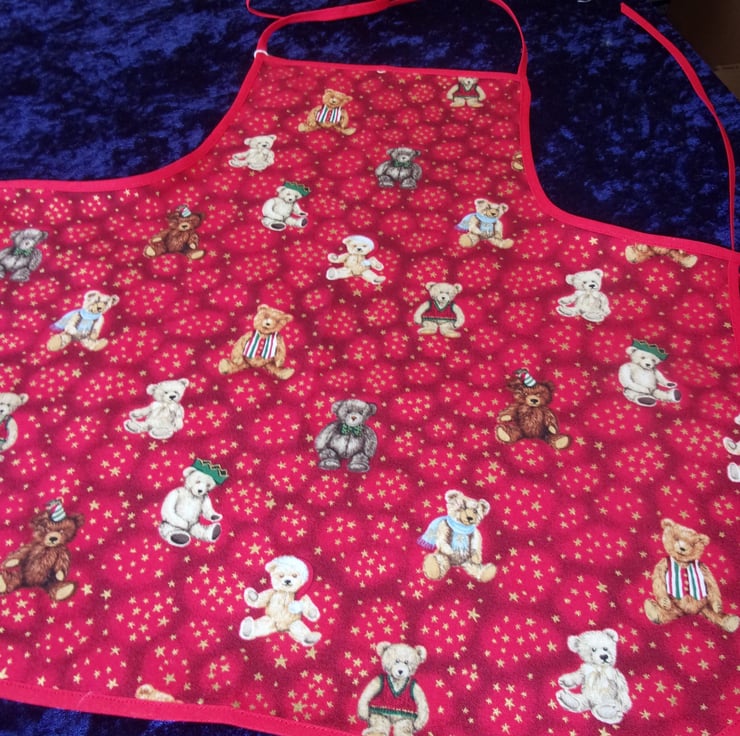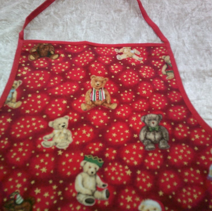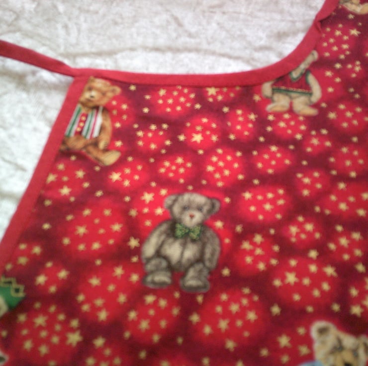 This Christmas apron is suitable for a child / baby of 1-3 years of age. It measures approximately 16 inches (40 cm) at the waist and 17 inches (43 cm) from the top of the bib part to the bottom - excluding the neck strap.