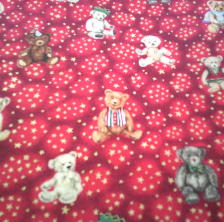 The design is Teddy Bears in Party Hats and Scarves on a Red background.