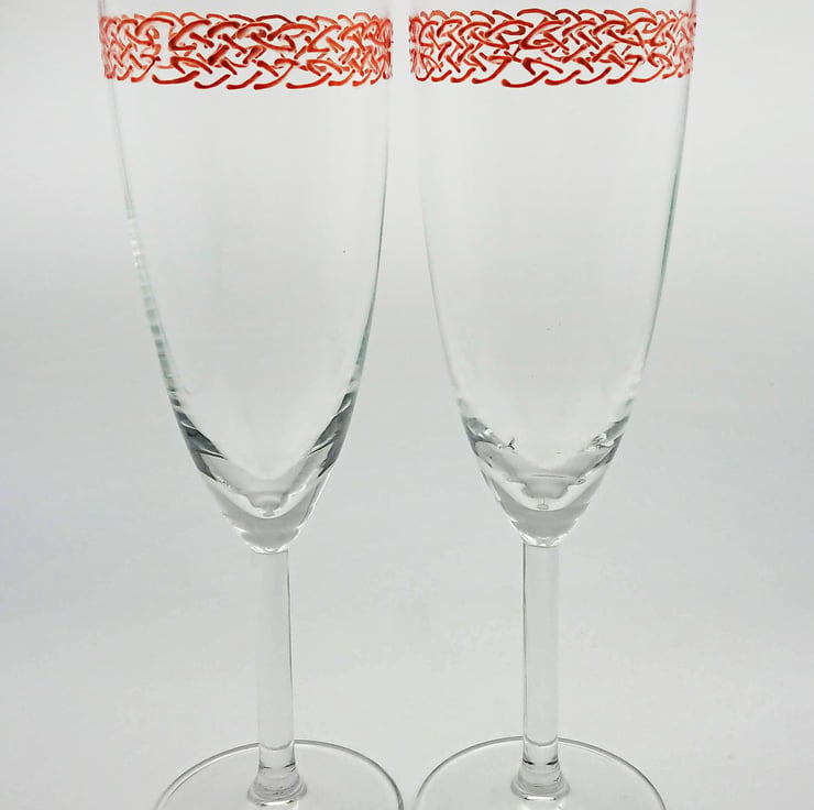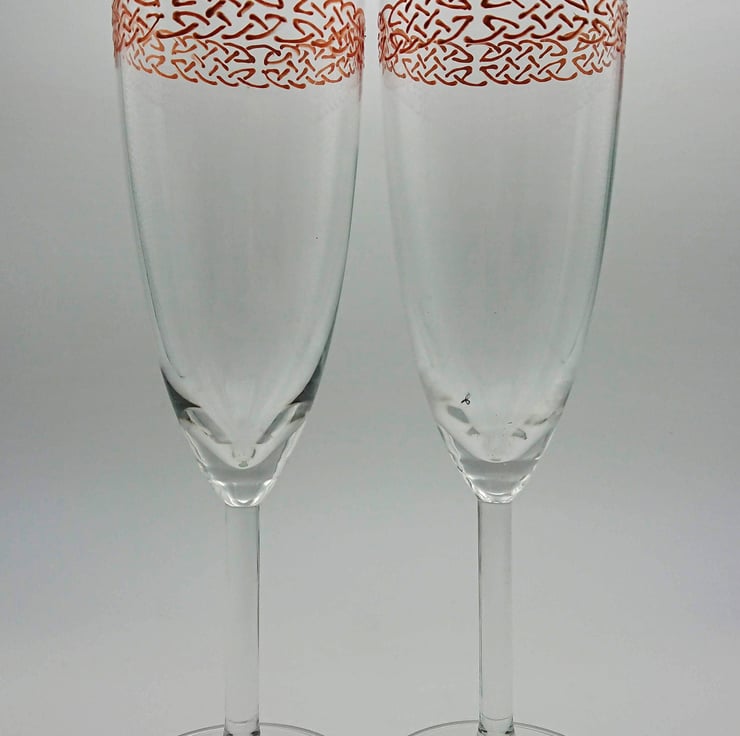 The listing is for a pair of champagne glasses, hand painted with a Celtic design in copper. This design is dishwasher safe .