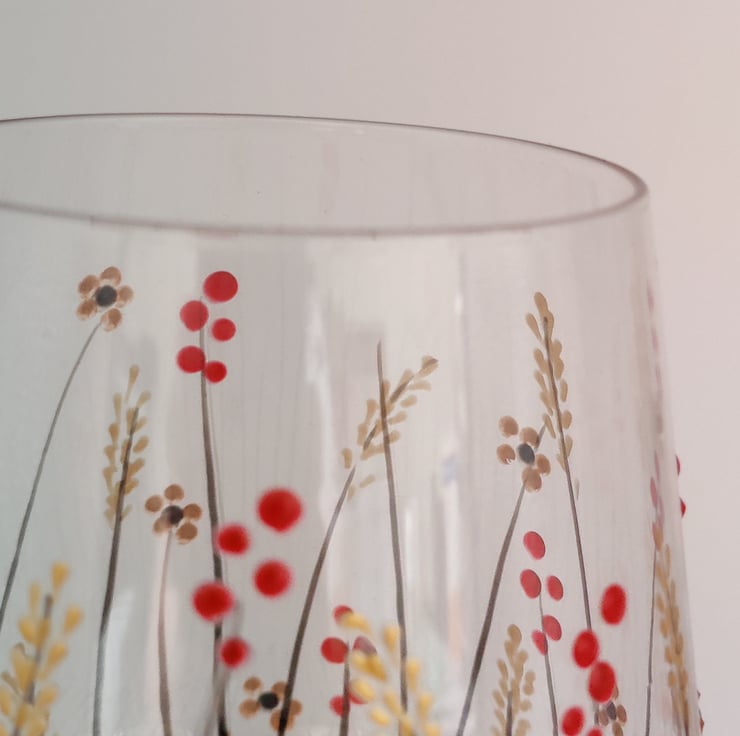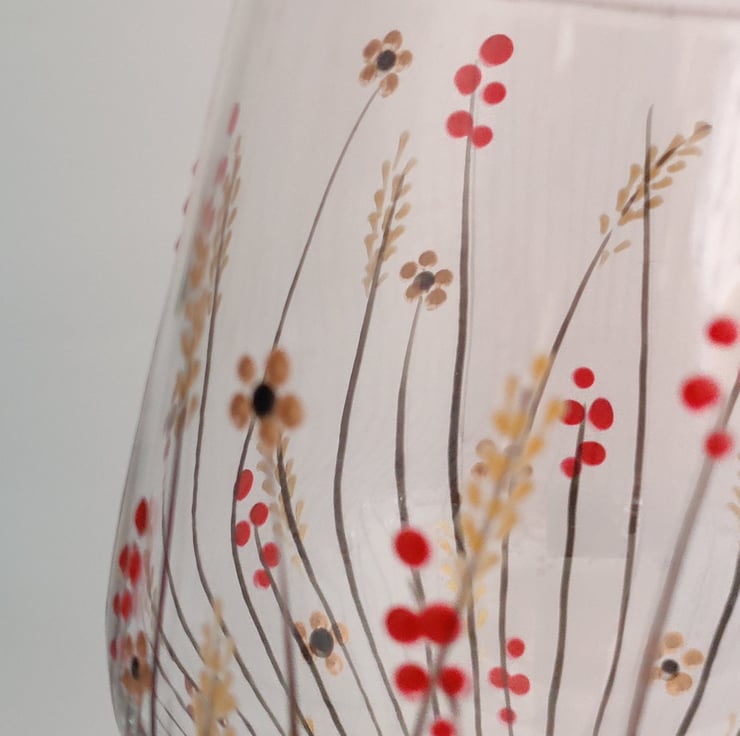 Hand painted Stemless Wine glass tumbler with ' Autumn Meadow' design.