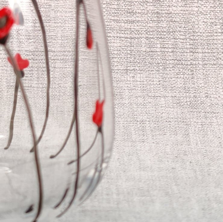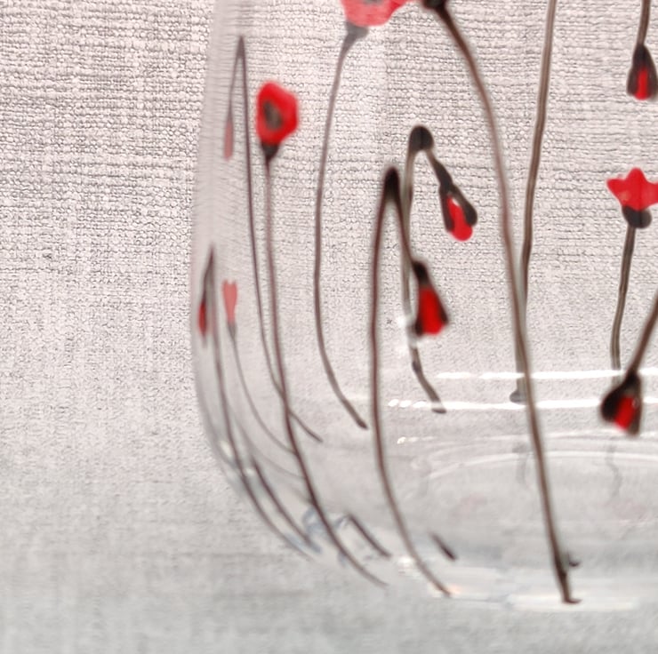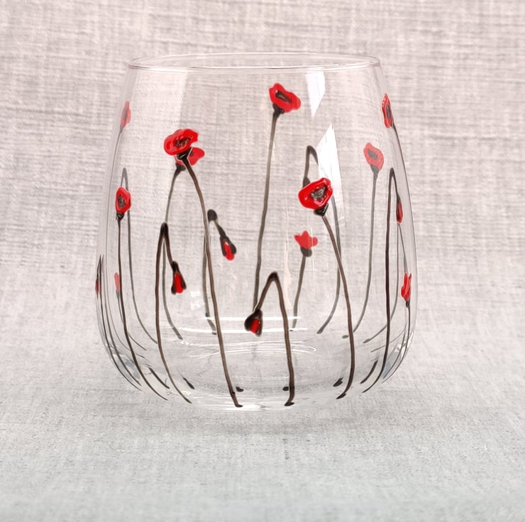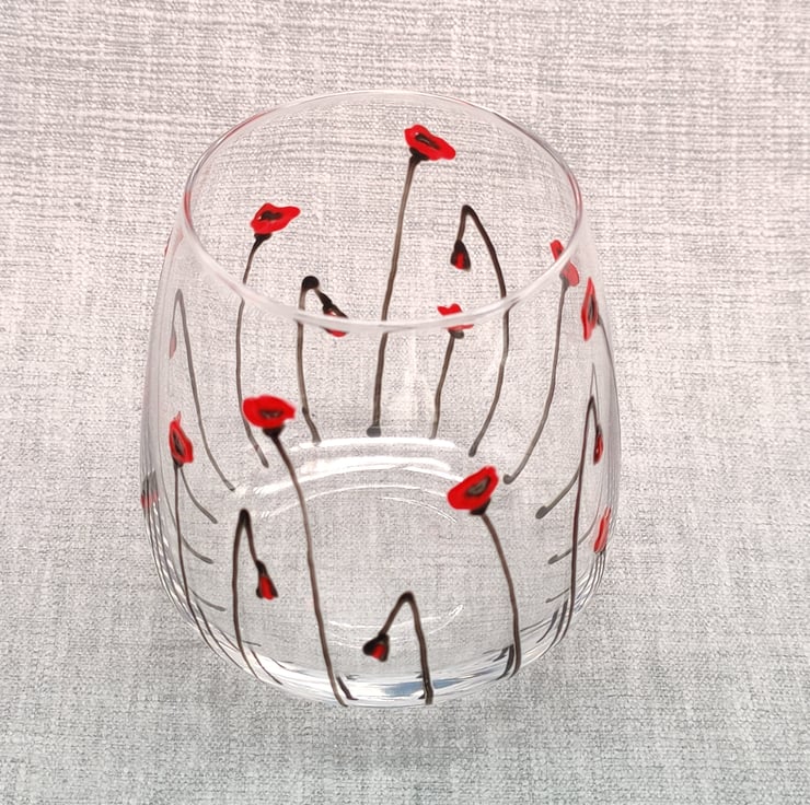 Hand painted Stemless Wine glass tumbler with ' Poppy' design.