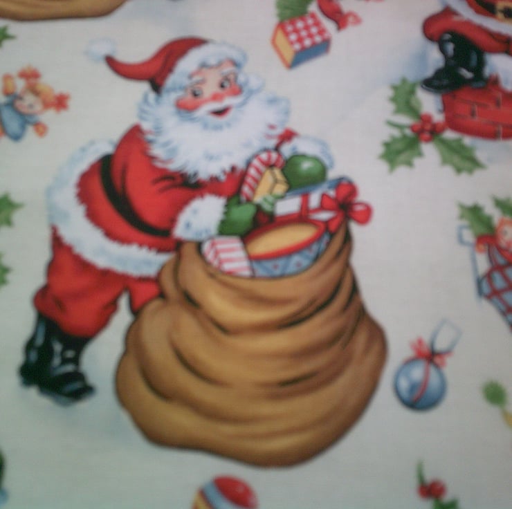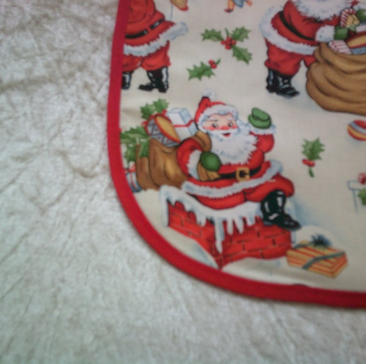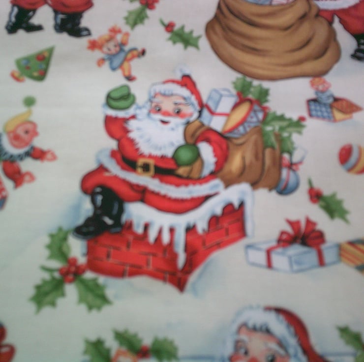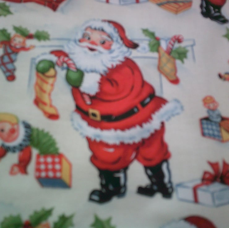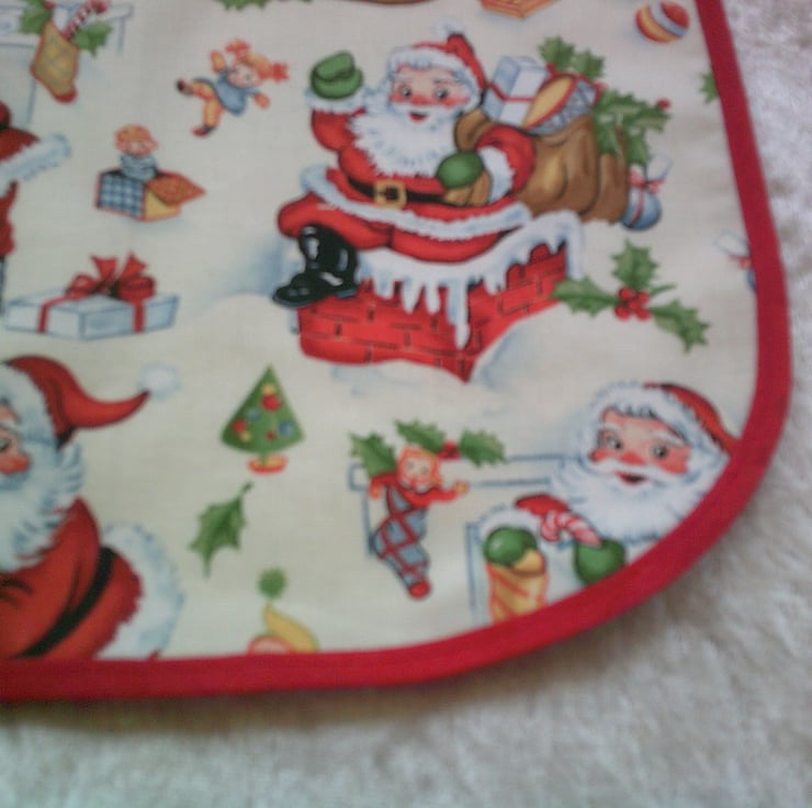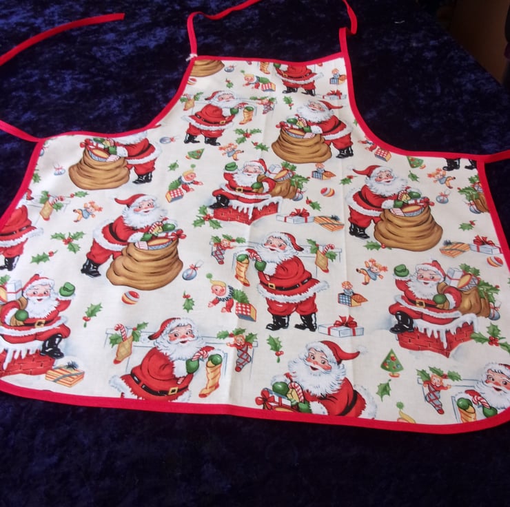 The design shows Santa Checking his sack to make sure that he has all the toys he needs ready to pop into the stockings that are also on the apron on a cream background edged with Red Bias Binding.