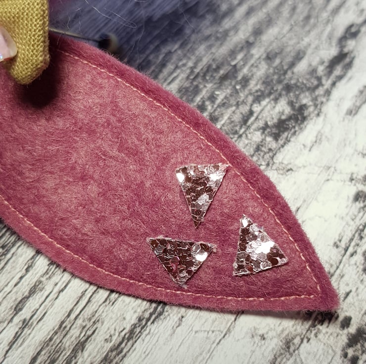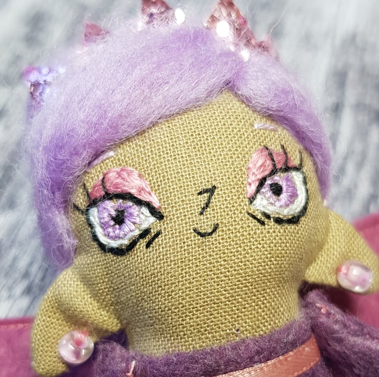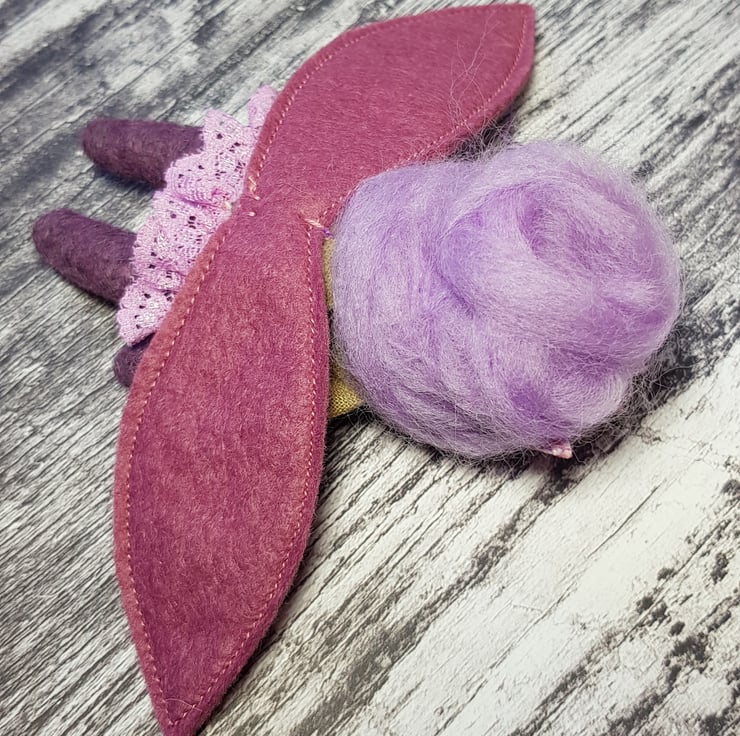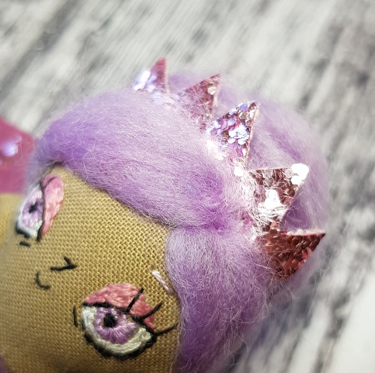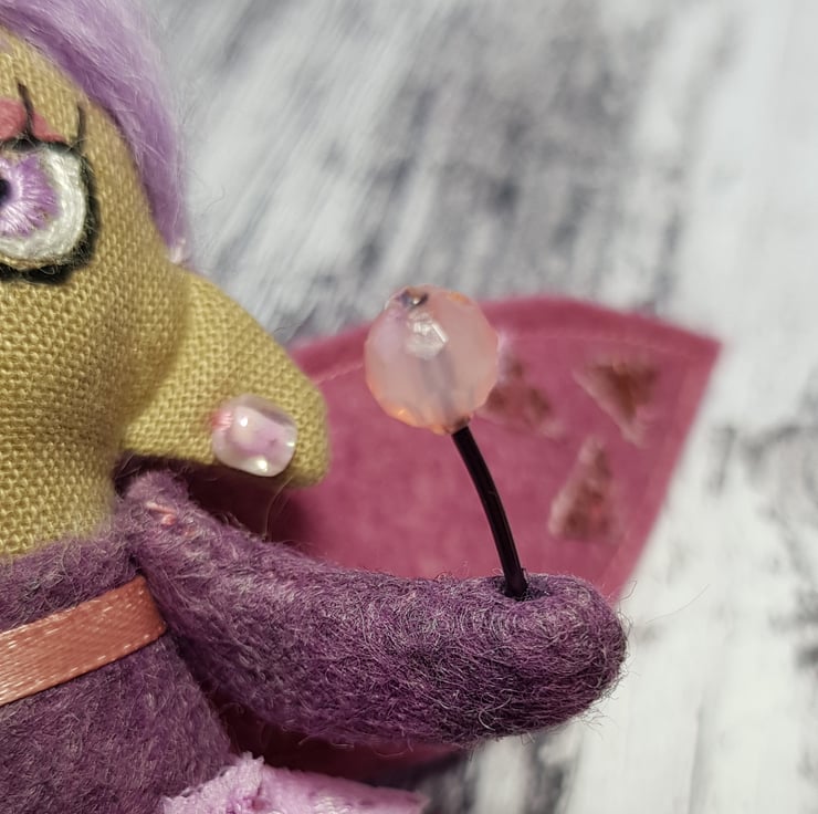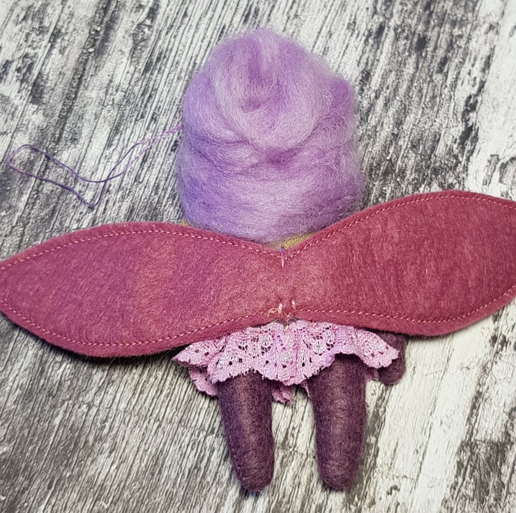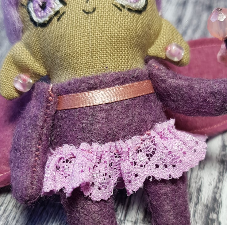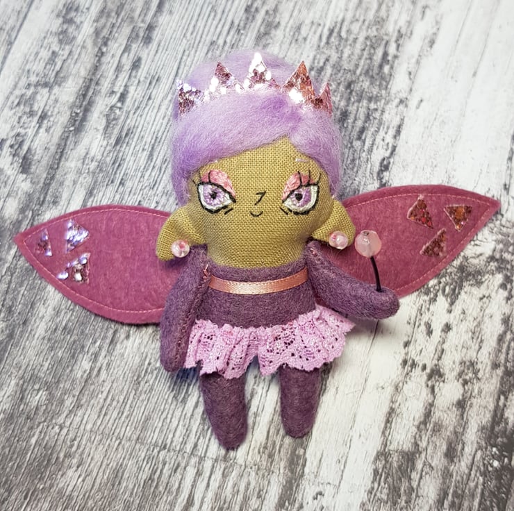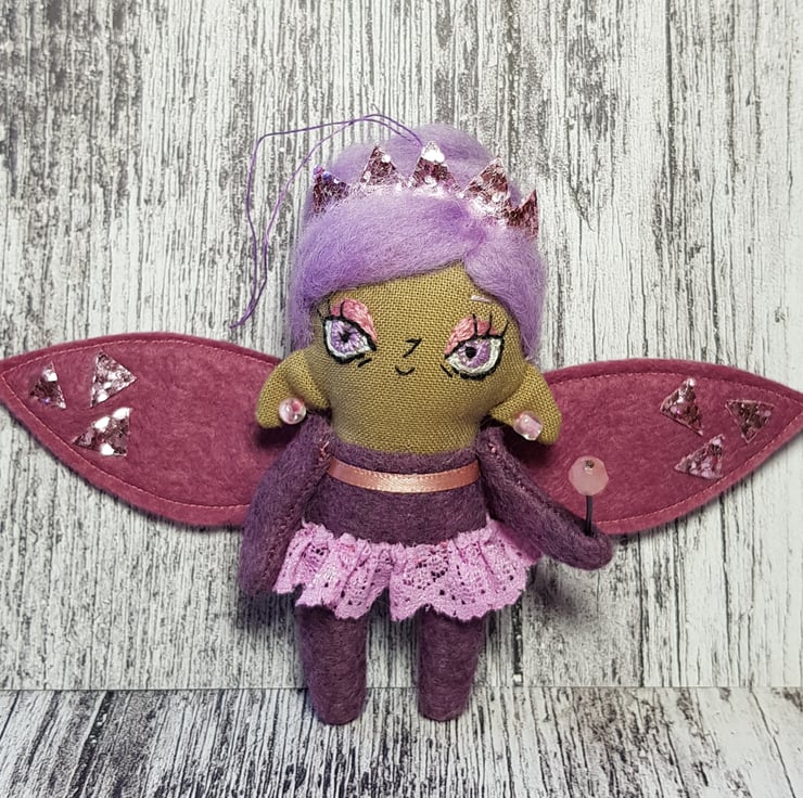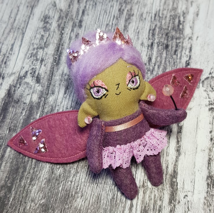Sugar plum fairy Miniature art doll in dusky purples and pinks. Penelope has a hand cut glitter crown amongst her needlefelted, hand dyed wool hair. Her face is hand embroidered and she has pink glass bead earings and a handmade bead wand glued into place. Her wings are made from soft felt with glitter triangles and her body is felt with ribbon around her neck and a gathered lace skirt hand sewn into place. She has a wingspan of 5 and a half inches and measures 4 inches tall. She can be displayed standing against something or hung from her thin thread hanger. Penelope is not a toy as she is handmade with delicate features, she is for decorative purposes only. Sent beautifully wrapped in recyclable packaging.