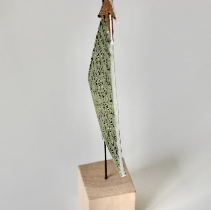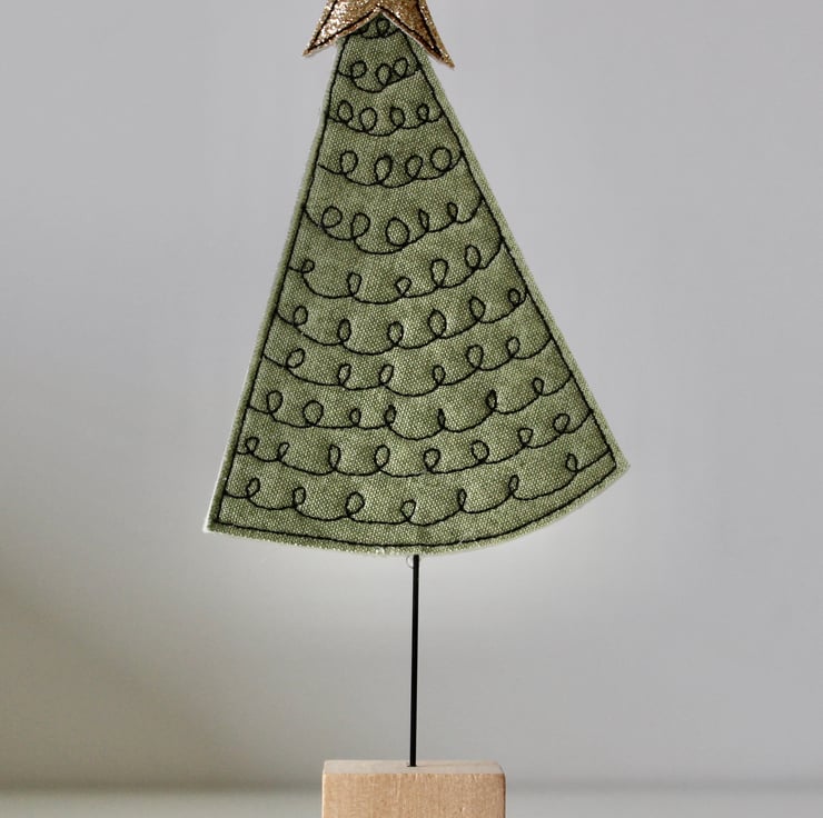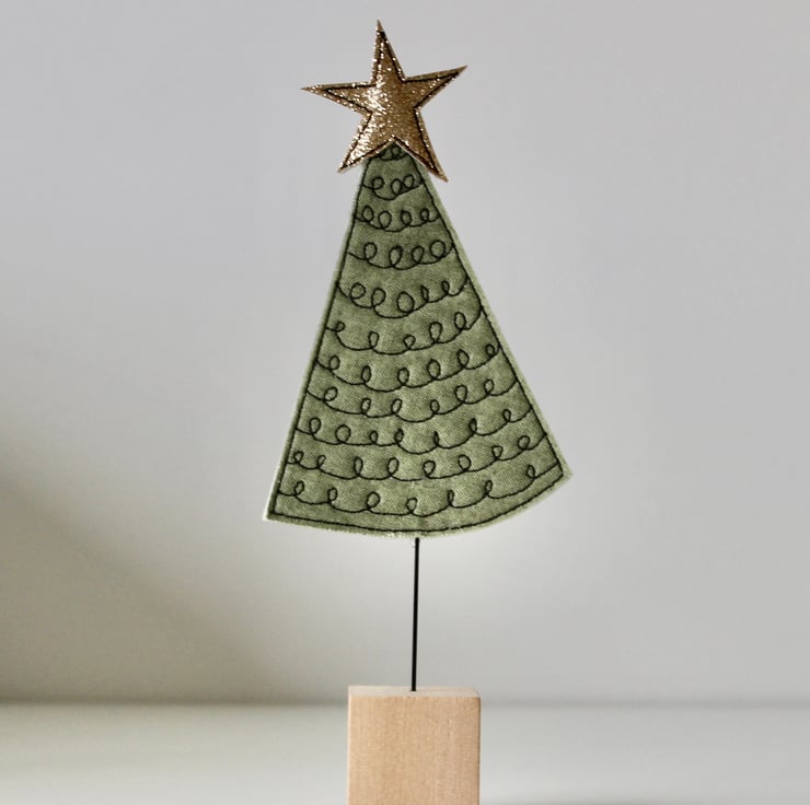Little trees are created using free hand machine embroidery, cotton fabric, 100% wool felt, glitter cloth and a sanded wooden cube off cut.