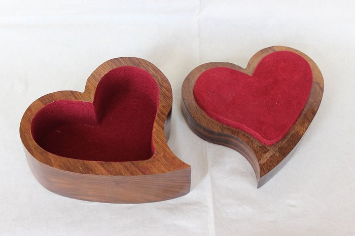 A beautiful jewellery - trinket box, shaped into a lopsided heart made from solid walnut. The simple but stylish design looks fantastic on any dressing table. The box exterior is finished in multiple coats of drying oil producing a luxurious, tactile, light gloss finish which allows the inherent beauty of the grain pattern to show through. The box internals are finished with soft red flocking.