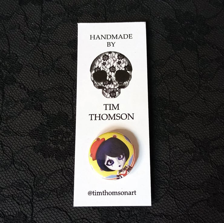 Milly the Joker is the first in a series of mixed media images that I'm creating as part of a 'Dark Doll Circus'. Milly is originally a Digital Painting, available as an open run of signed giclee prints, but you can now wear her portrait as a pin badge!