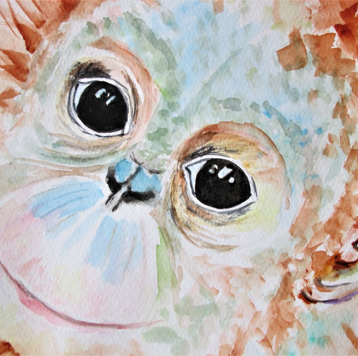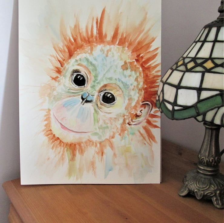 (887) An original watercolour painting of a lovely and softly coloured orang-utan is featured here. A cute smiling little baby orangutan monkey with, what appears, a bad hair day.
