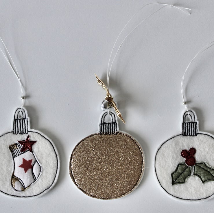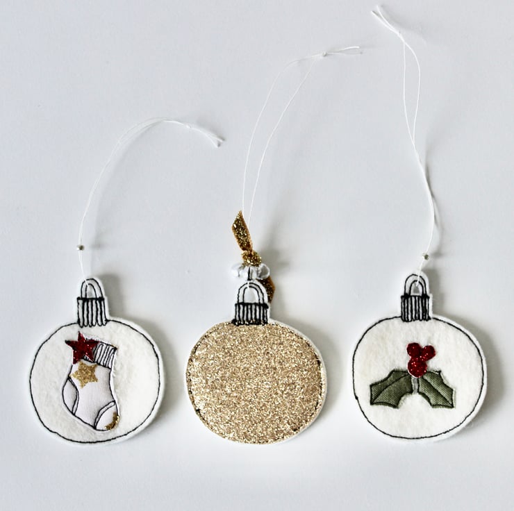 A set of three wool felt baubles; stocking, golden glitter and holly.