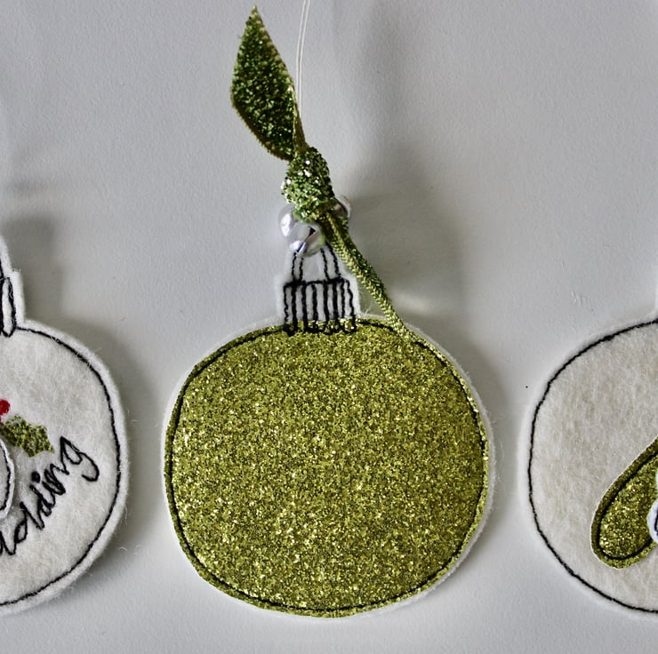 Wool felt baubles are created using 100% cream wool felt, glitter cloth, cotton cloth and free hand machine embroidery; each is cut out by hand, using a very sharp pair of scissors. There is ribbon and a bell to finish the glitter bauble.