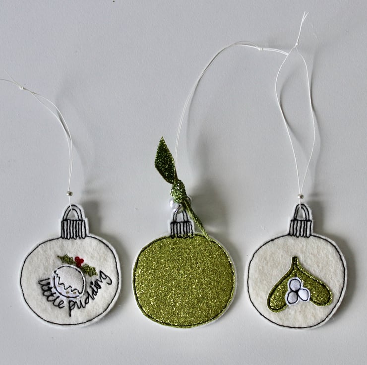 A set of three wool felt baubles; little pudding, green glitter and mistletoe.