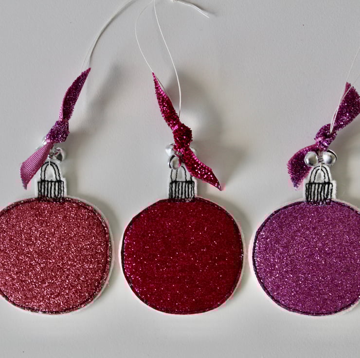 A set of three glitter and 100% wool felt baubles, in pinks.