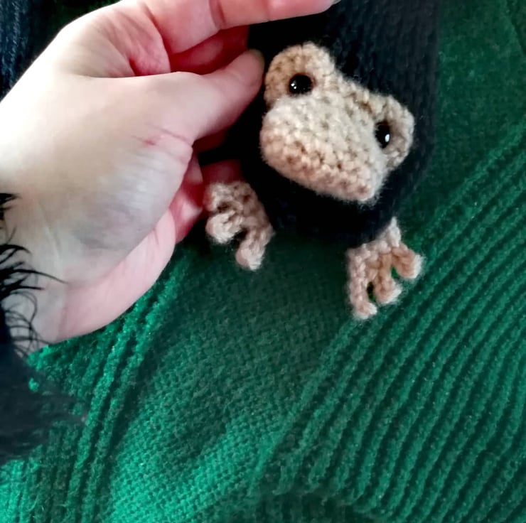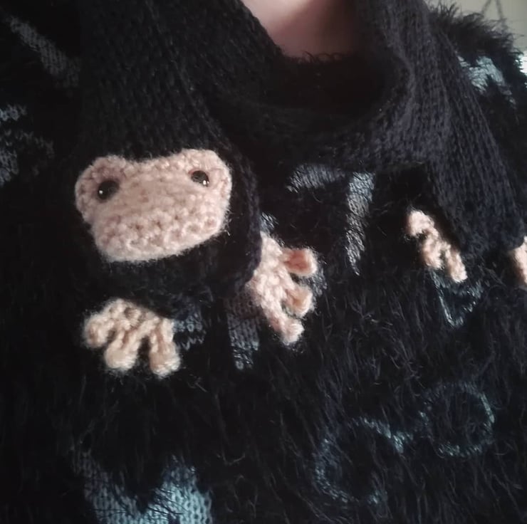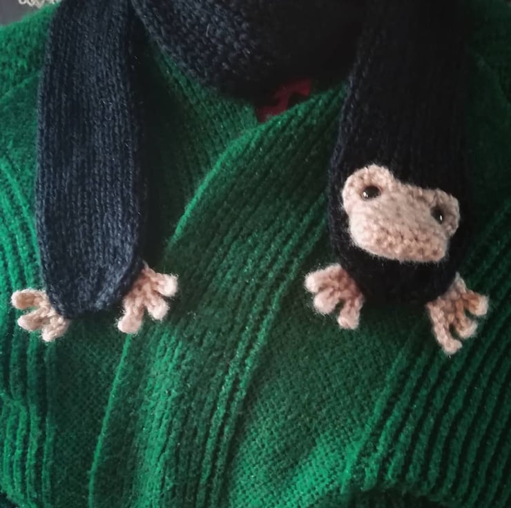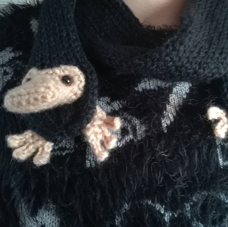 This scarf is made from a lovely soft black yarn with a little Niffler face and feet.