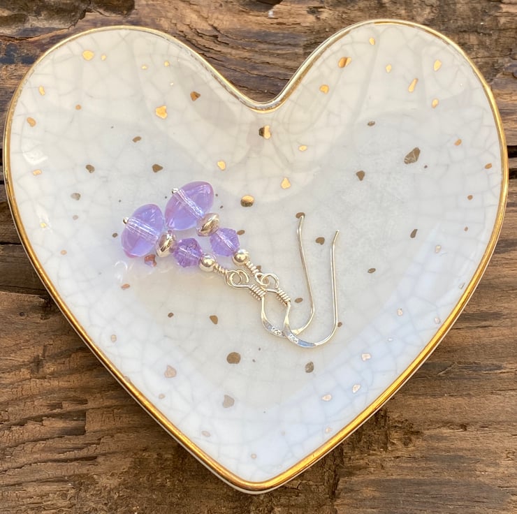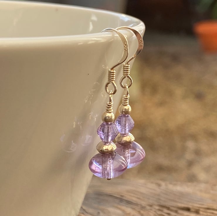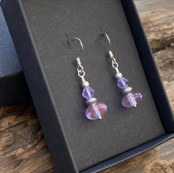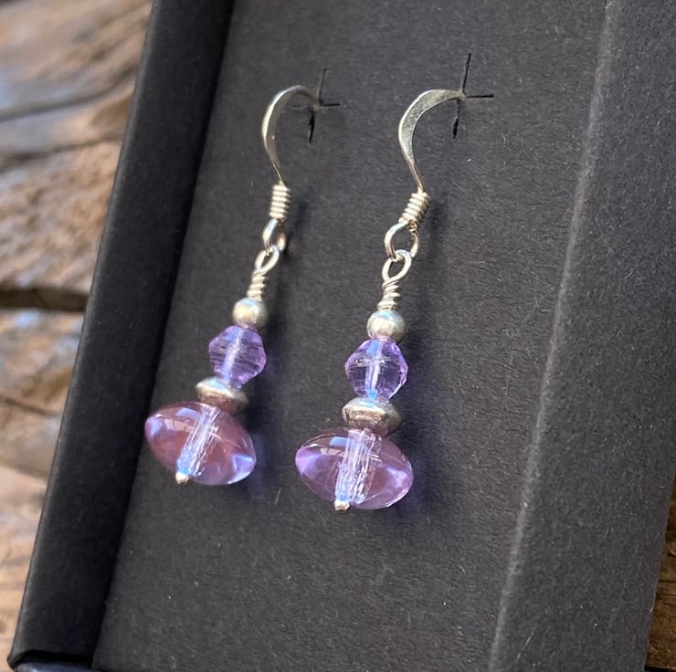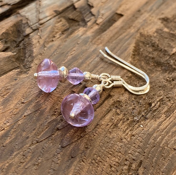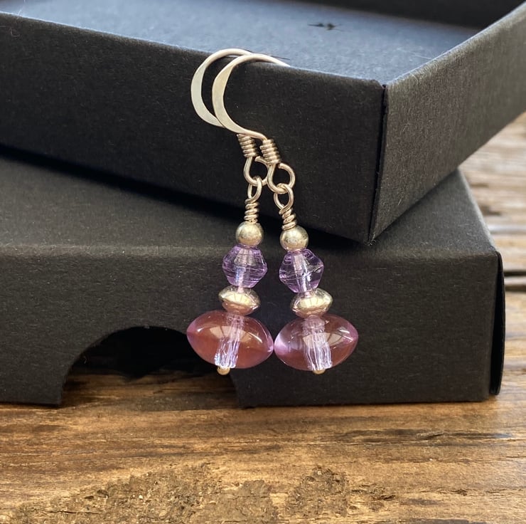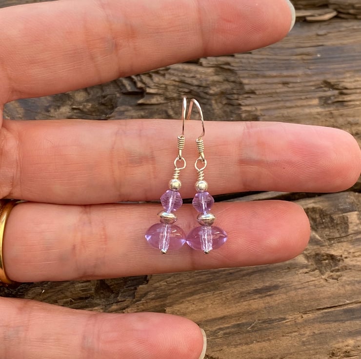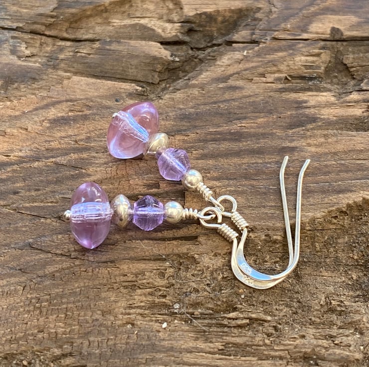 Pretty clear lilac glass beads with a pinkish tint (seen in some of the photos) hand wired onto a sterling silver headpin with sterling silver beads. Hangs upon sterling silver earrings.