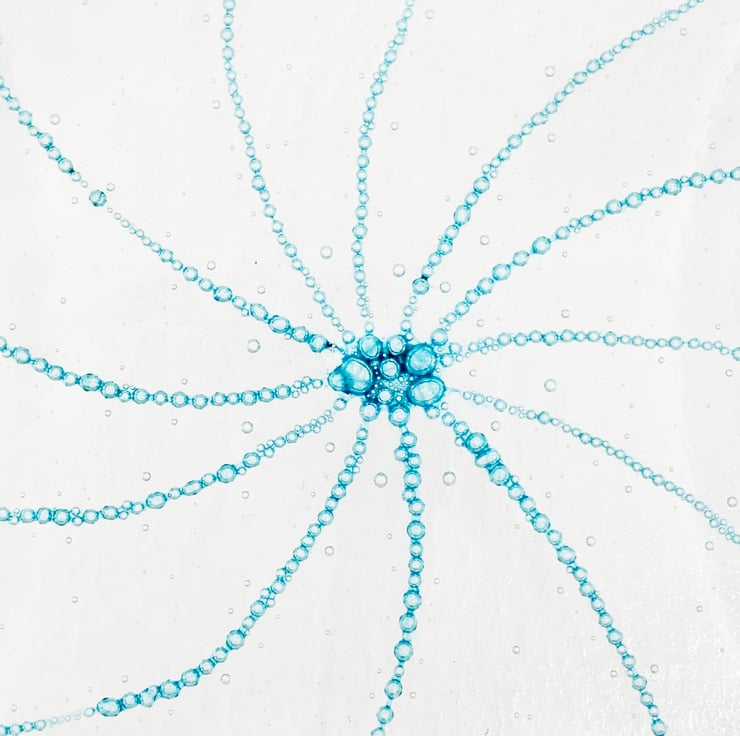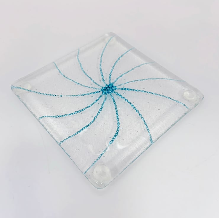 To make the coasters I cut art glass into 10cm squares and use specialist paint to carefully paint my swirl design. I then cap it with another square piece of glass and fire it overnight in my kiln. The heat of the kiln turns the paint into tiny turquoise bubbles. Transparent glass with turquoise bubbles captured inside.
