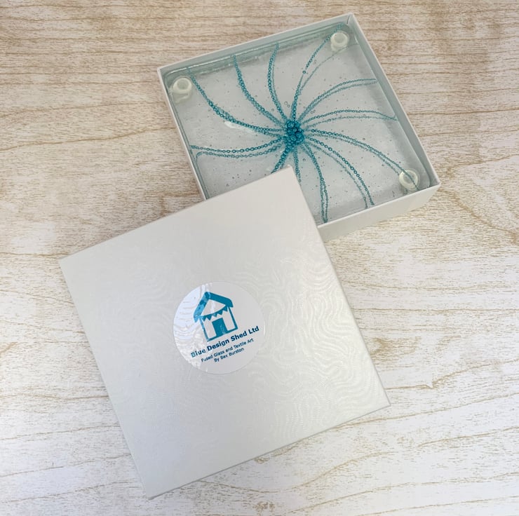Fused glass handmade bubbly swirl coasters. These are a set of 2 coasters which come in a gift box, perfect as a gift. Transparent glass with a hand painted turquoise bubble swirl in the centre of the coaster. I use rubber feet on the underside of all my coasters to provide a non-slip and non-scratch base.