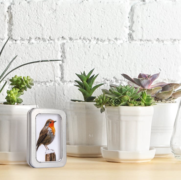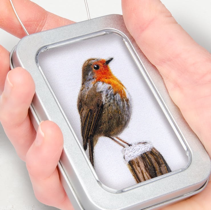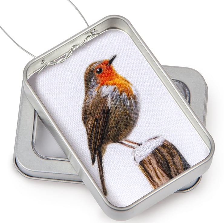 This is a 3D fabric Robin, framed in a sturdy little recyclable aluminium tin, with a wire hanger.