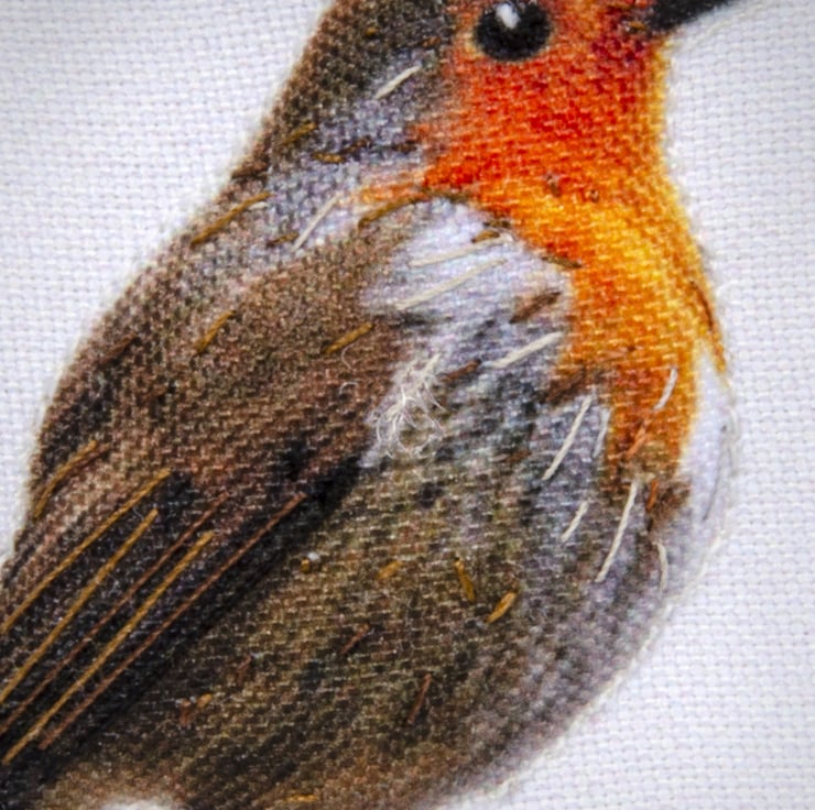 An embellished fabric print, carefully machine stitched and slightly padded, to give an unusual three-dimensional appearance. I have added the details with hand-embroidery.