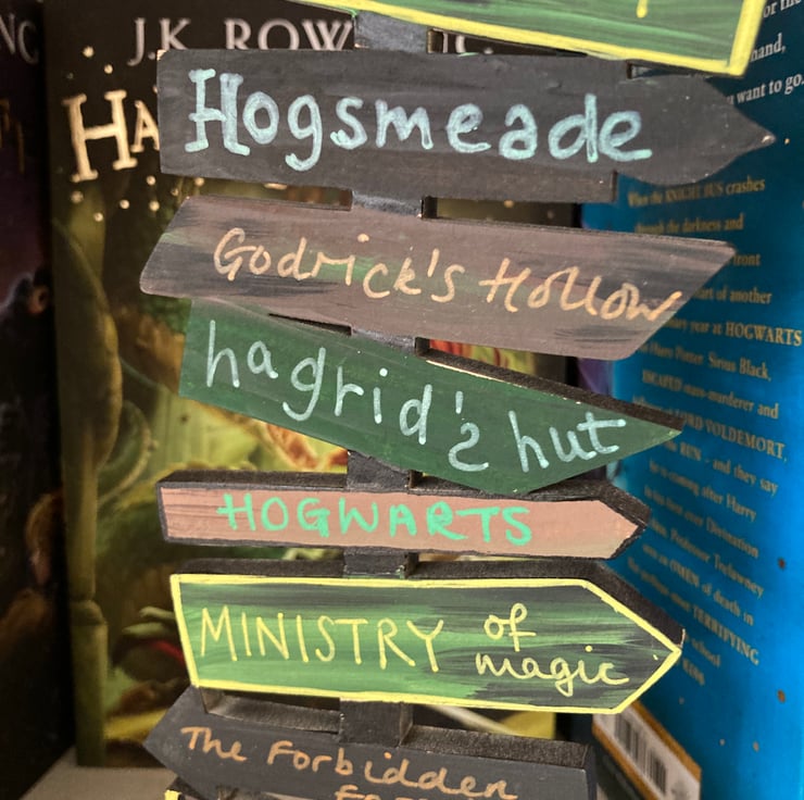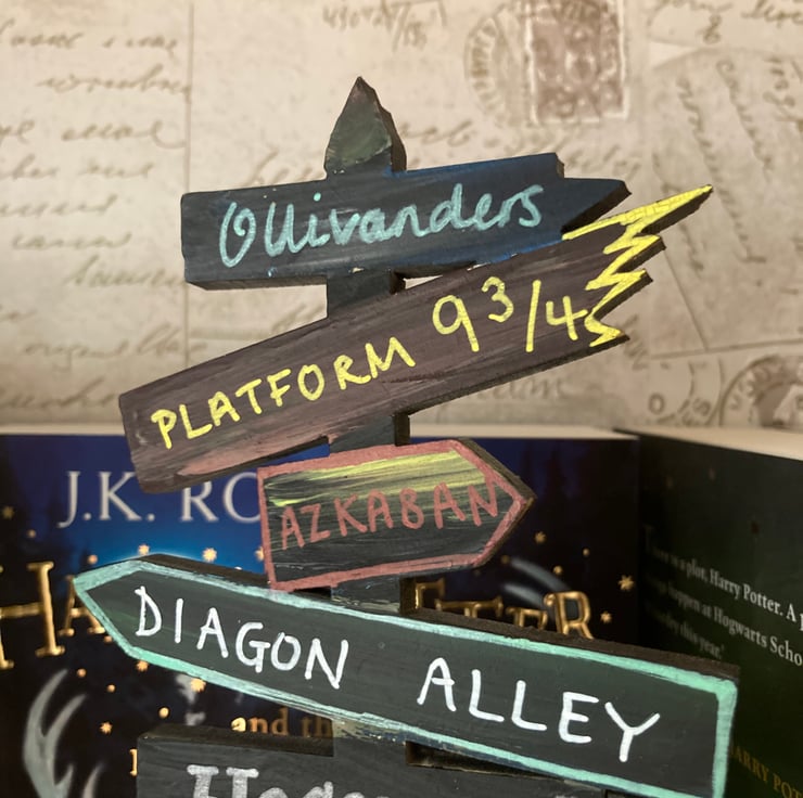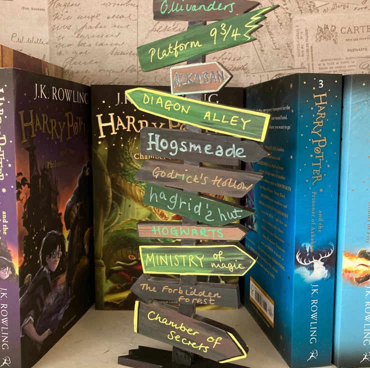 Hand painted with locations from the Harry Potter books. Each one is unique and perfect for any fan, so may differ slightly from the pictures. Looks great on the bookshelf of any bookworm.