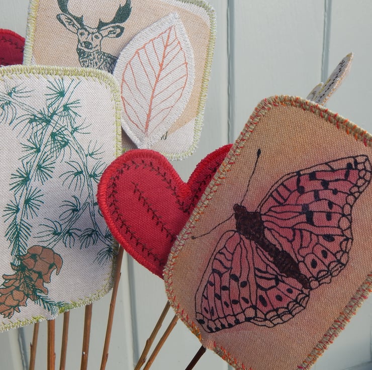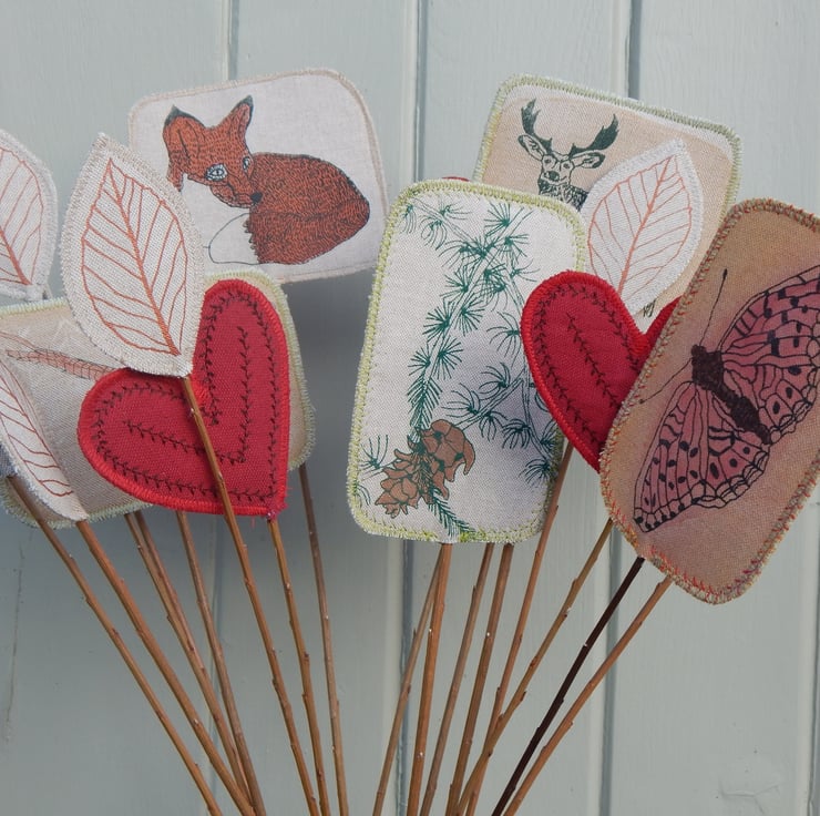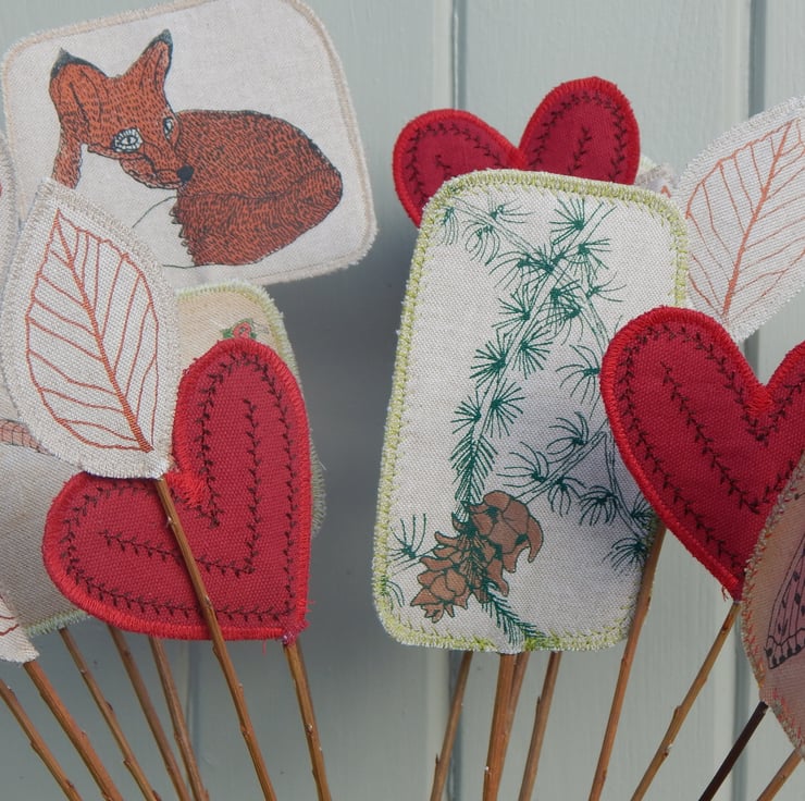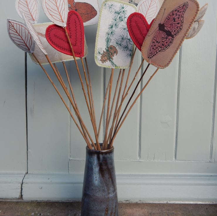 This is a bouquet of 16 fabric on willow creations. Each is double sided with interfacing for stability. They are all have running stitch and then a zig zig stitched finishing to ensure fraying is kept to a minimum. They are then hand glued onto willow which measures about 30 cm in length.