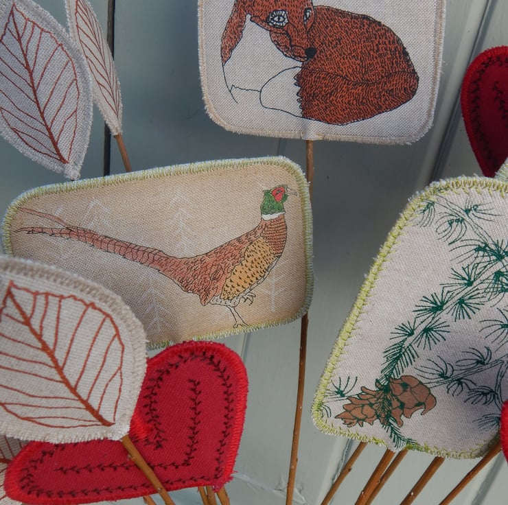 There is one fox screen printed, 1 butterfly, 1 pheasant, 1 pine branch with cone and 1 stag. There are beech tree leaves screen printed in metallic gold and machine embroidered red and beige cotton hearts.