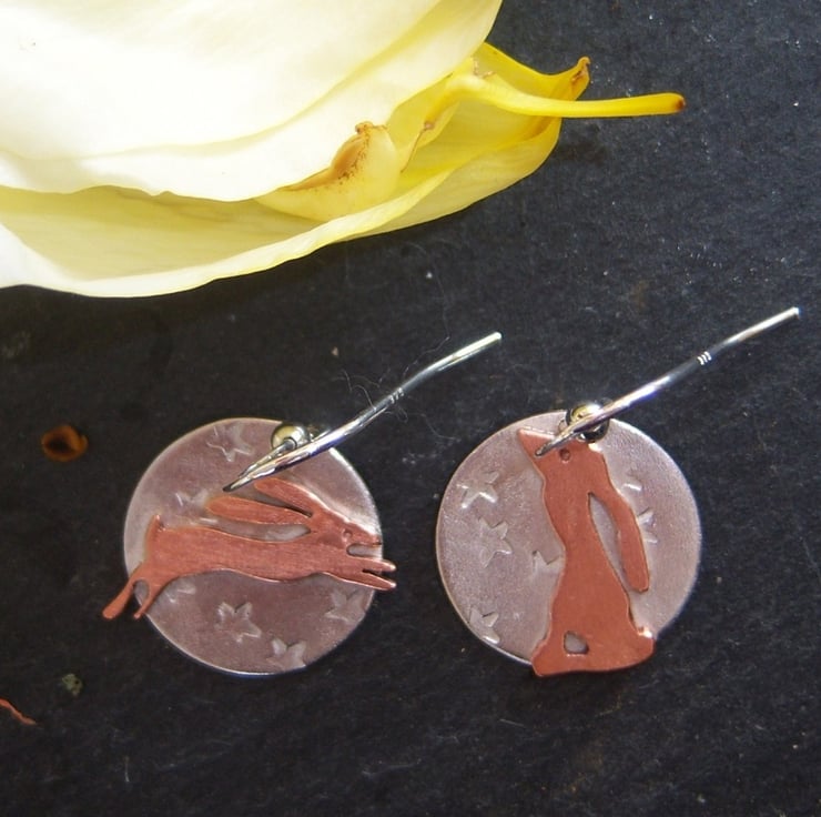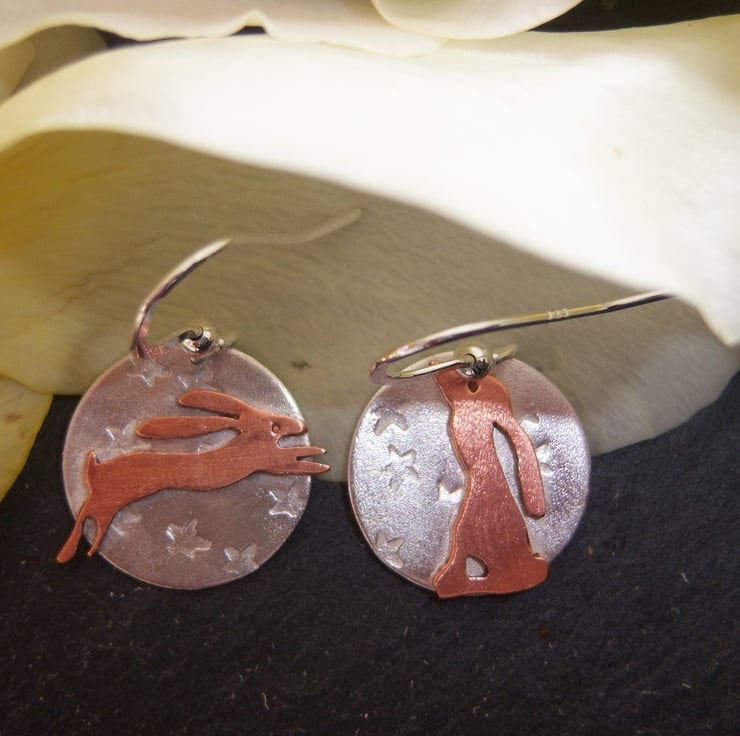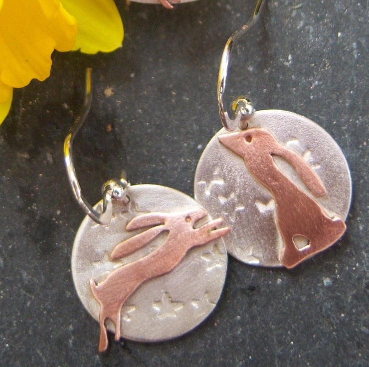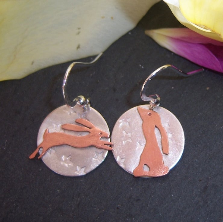 Mismatched copper hares on sterling silver flat disks with a random star imprint. One hare is leaping and the other is moon gazing. The disks are 16mm across. Sterling silver ear hooks.