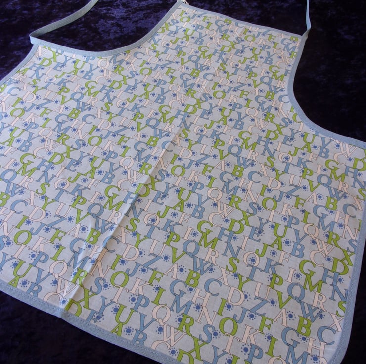 The design features the alphabet in Blue, Green and white on a pale blue background. The apron is edged with a contrasting blue bias binding.