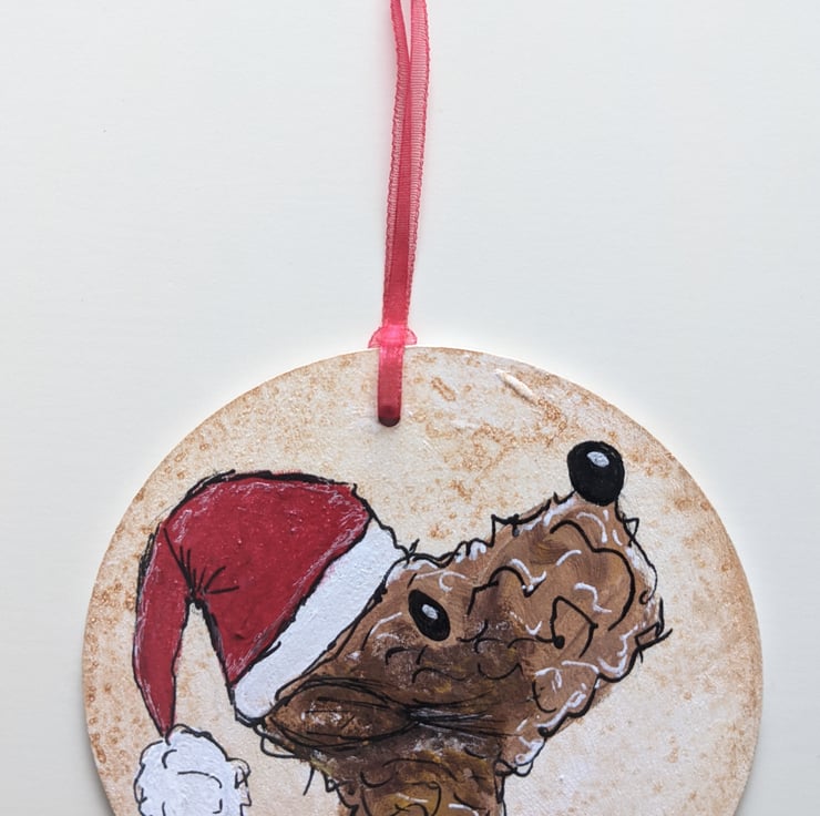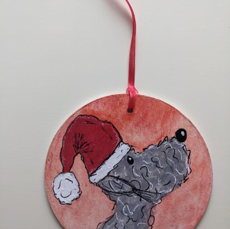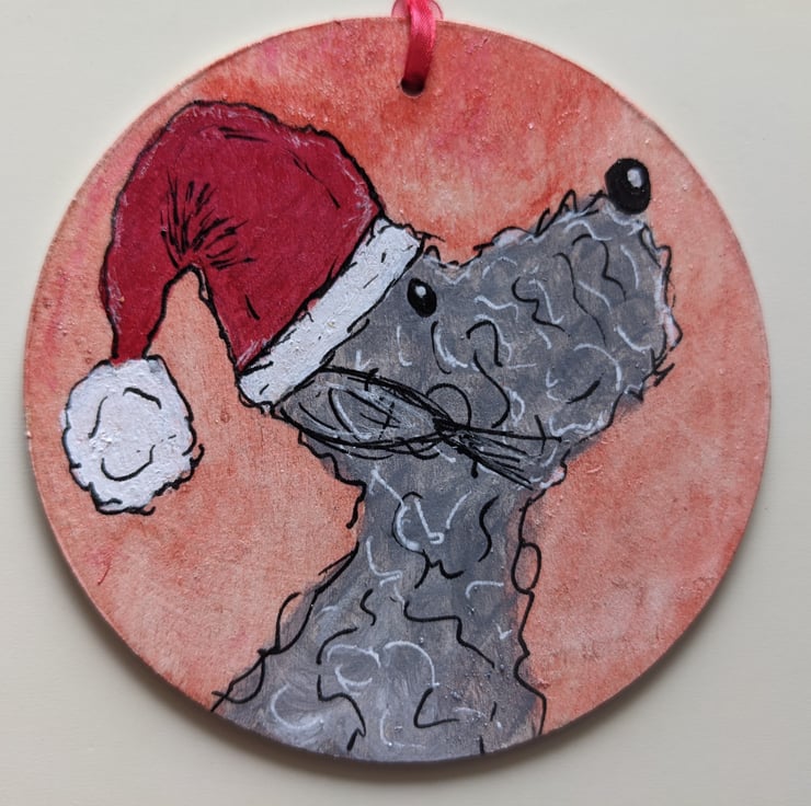 A handpainted wooden Christmas decoration, featuring a painting of a Bedlington Terrier Dog wearing a santa hat. The dog wearing their santa hat has been painted onto a wooden 10cm circle, using acrylic and ink