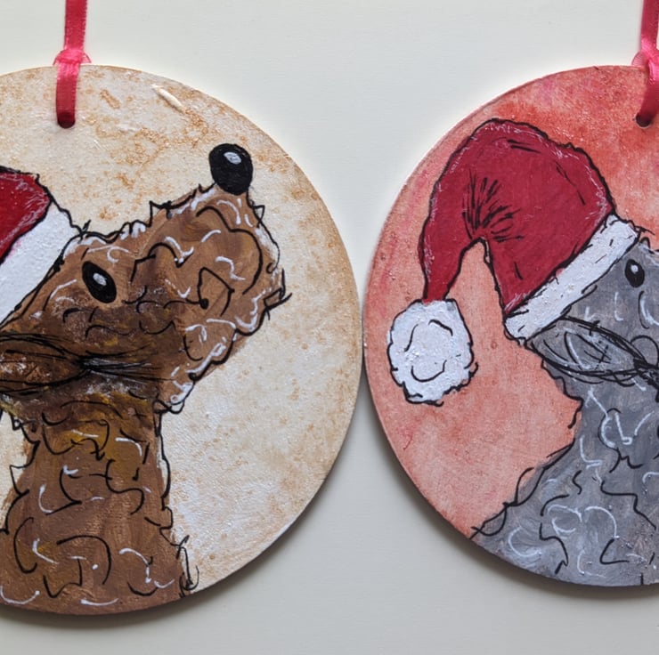 I have two Bedlington Terrier dogs, and they often inspire my work. It seemed totally natural to create Christmas decorations featuring my dogs.