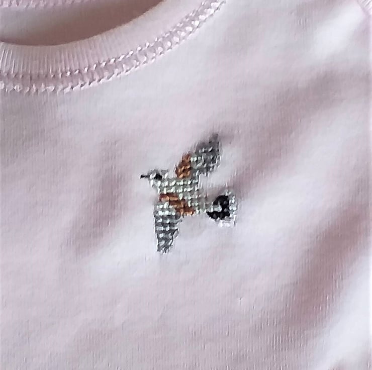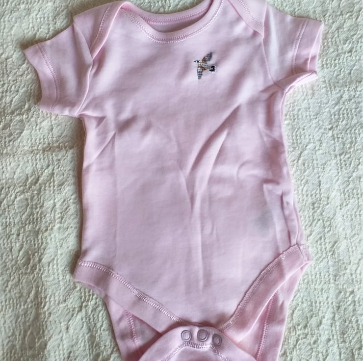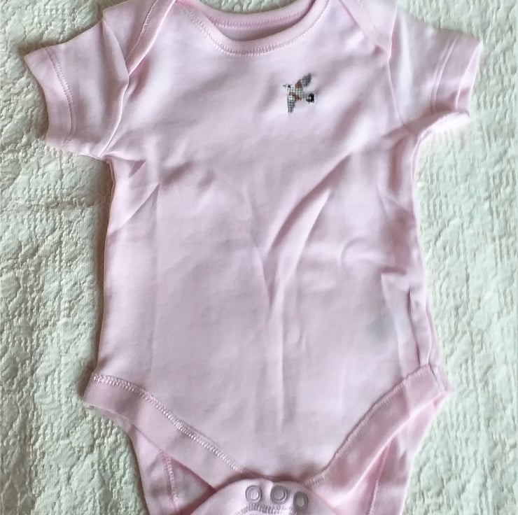 I have hand embroidered a tiny flying turtle dove on the left front of this pretty baby pink vest/onesie. The vest has short sleeves, an envelope neck and three press studs between the leg holes. It is all cotton and can be machine washed.