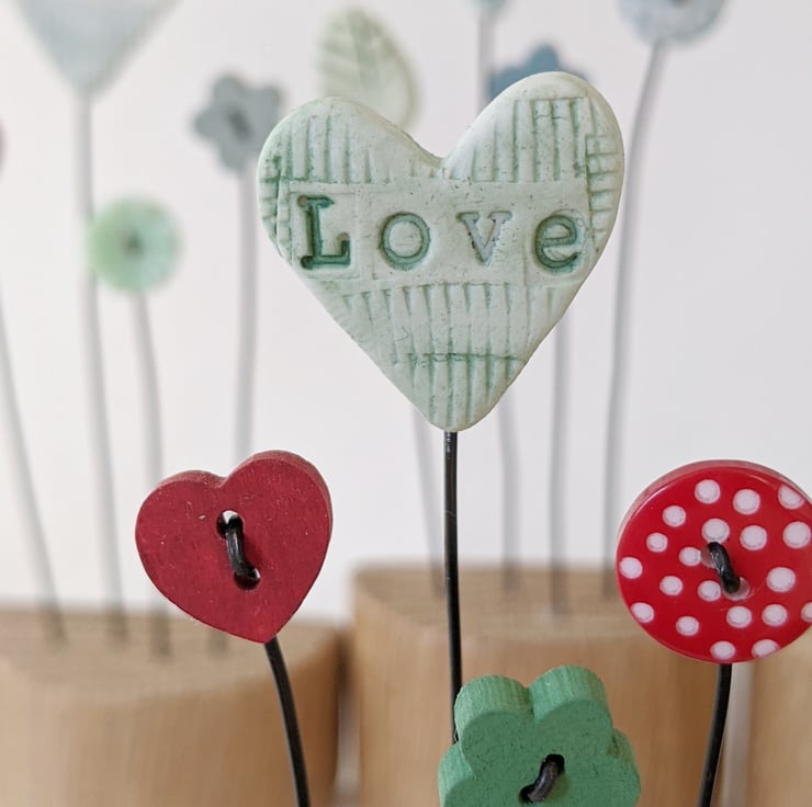 This pretty heart is handmade from polymer clay. It stands on a wire stalk alongside little button flowers in a sanded and waxed oak block.